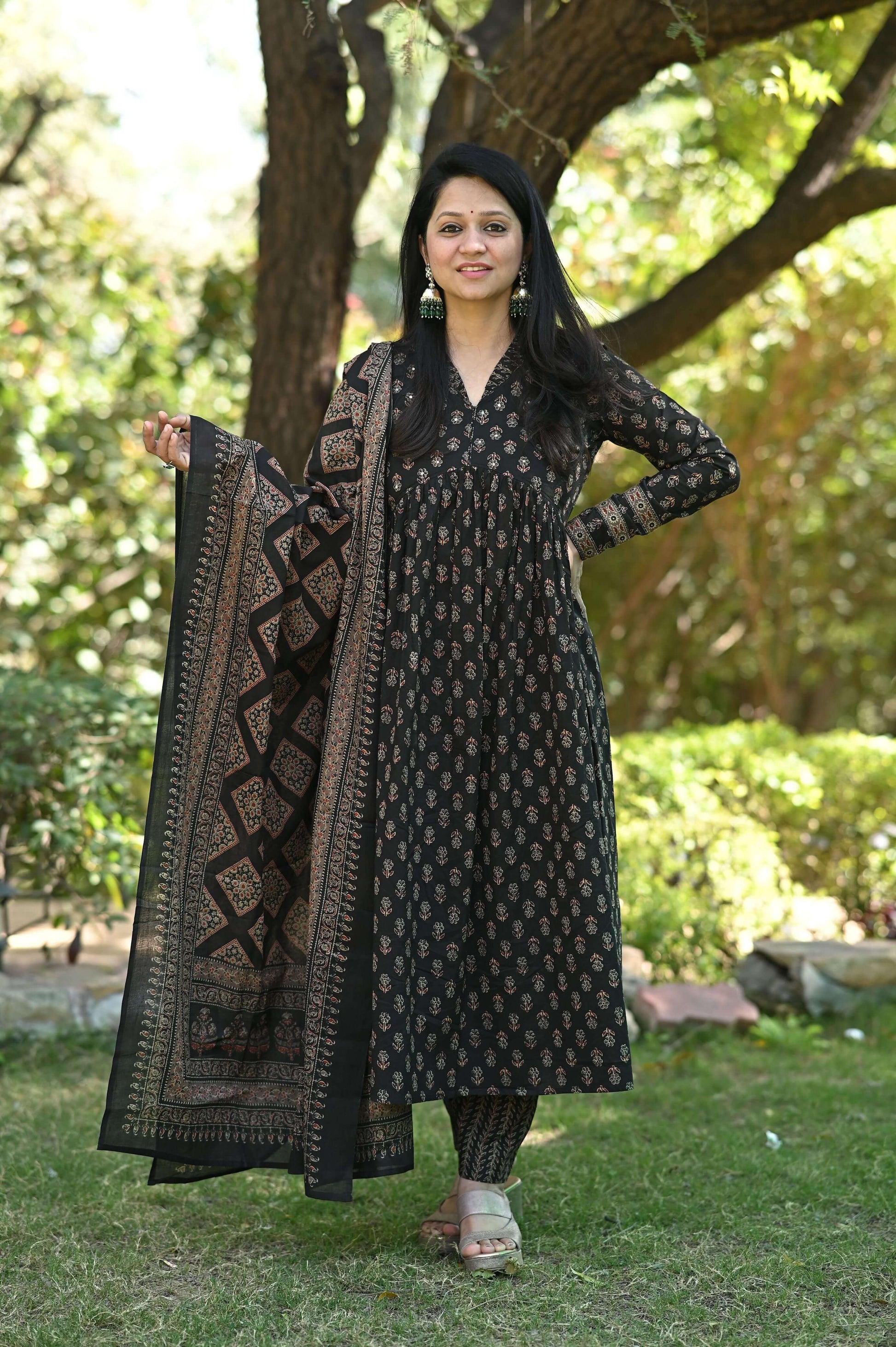 The suit set also showcases an exclusive *Ajrakh* Print, adding a cultural element to the design.