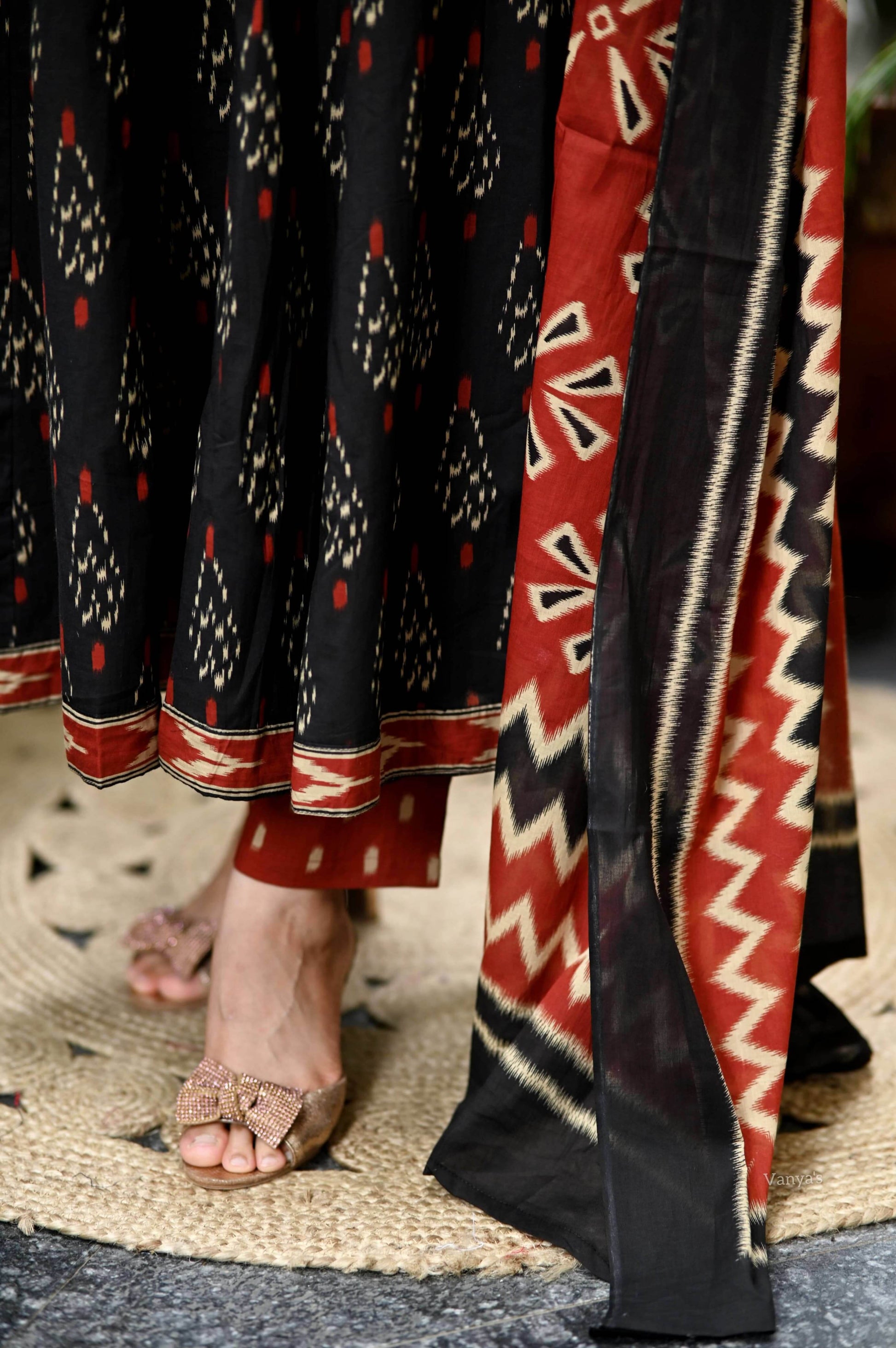 Shop this never seen before outfit..... Black and rust discharge cotton printed three piece cotton anarkali is just perfect for your every occasion to look absolutely classy and different....stylish neck coutch pattern.