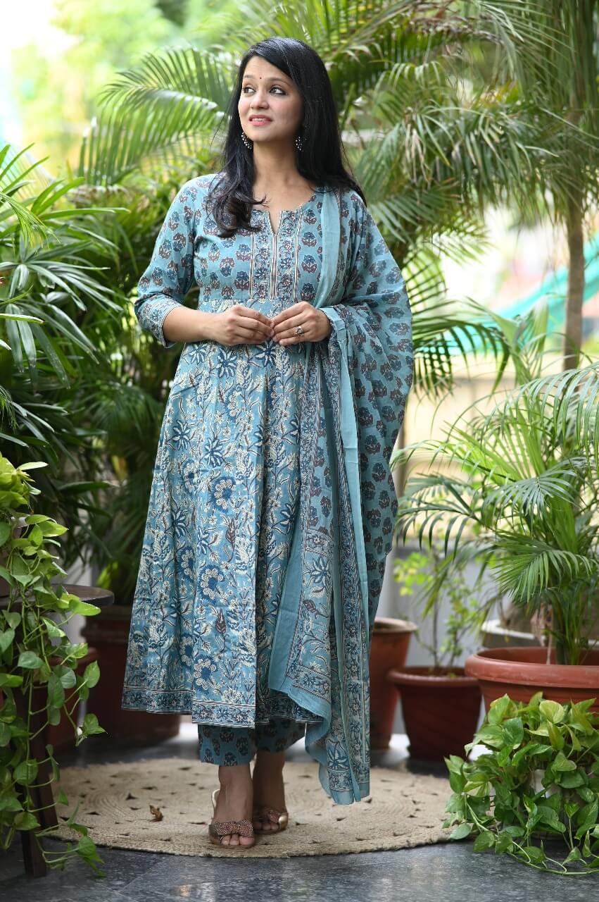 This anarkali suit set is made from soft cotton and and showcases traditional hand block printing with graceful floral patterns. Yolk Adorned with delicate Zari embroidery.Complemented by matching printed pants and a lightweight mulmul dupatta, it combines comfort with cultural elegance. Perfect for daytime occasions, festive celebrations, or sophisticated everyday wear.