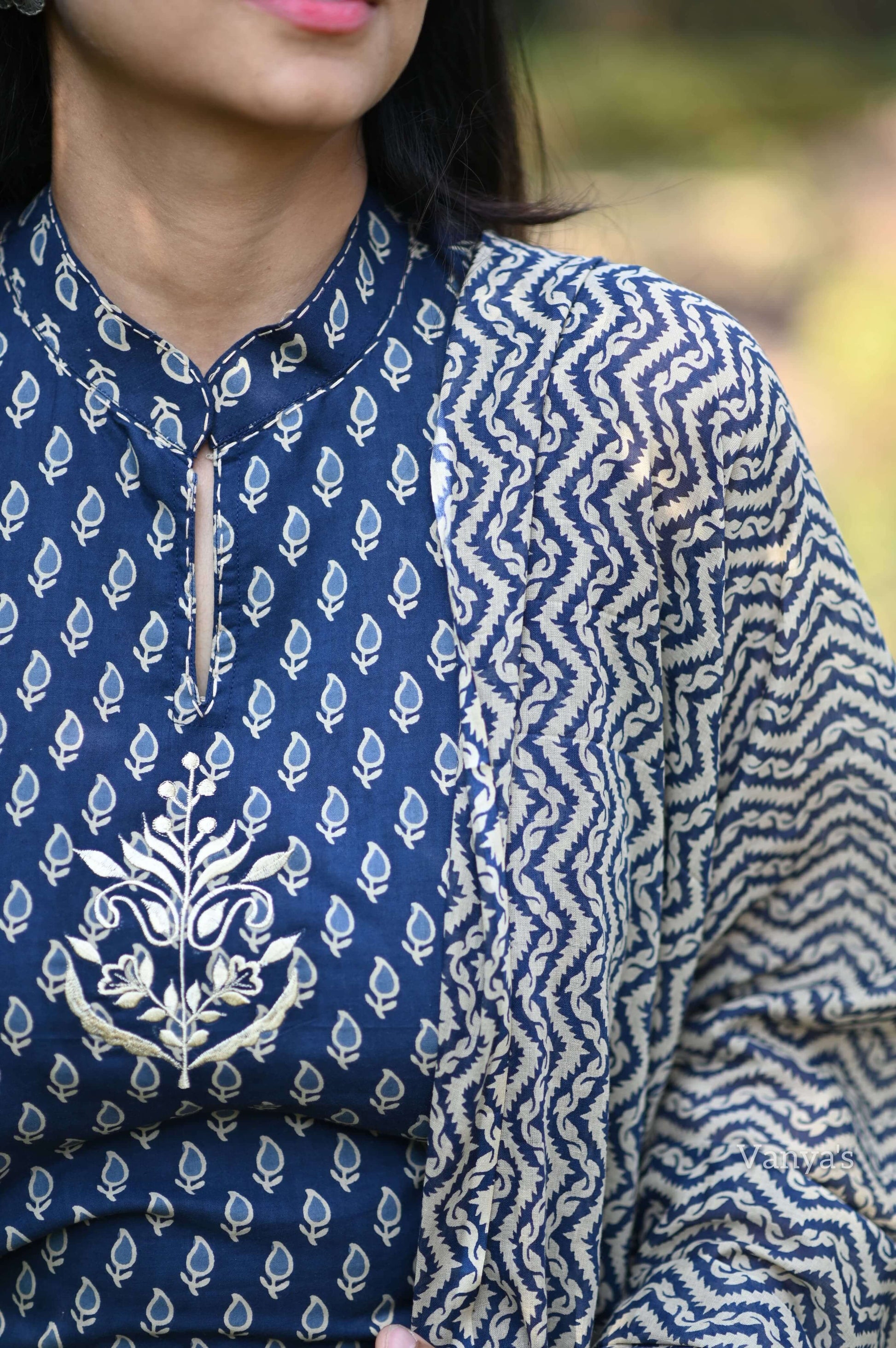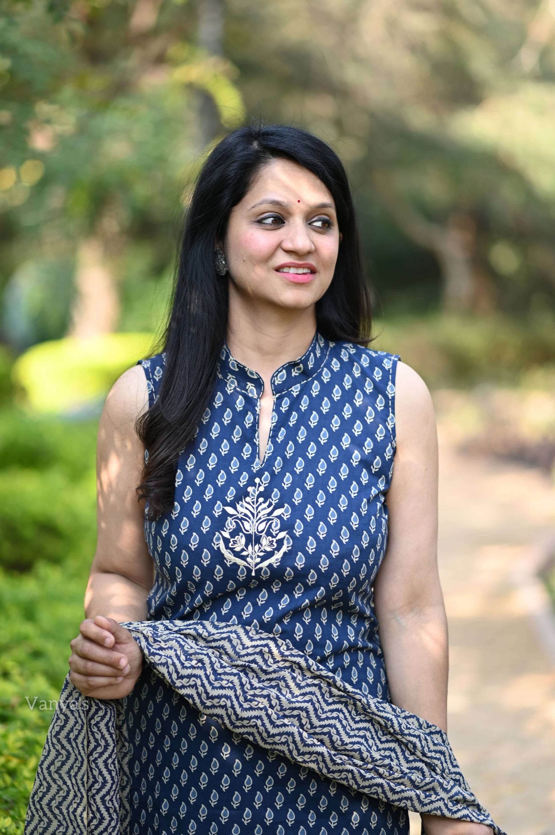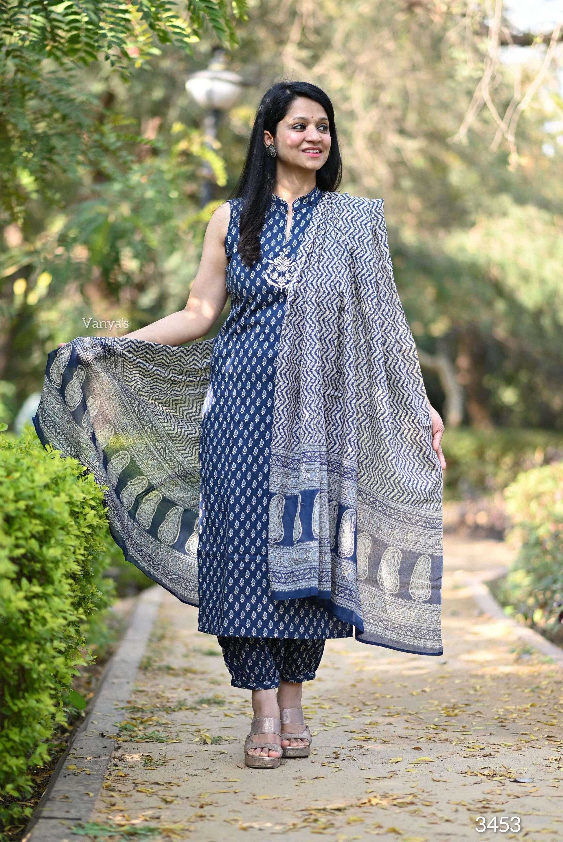 Seize the day beautifully in our oh so gorgeous sleevless cotton suit set. This blue jaipuri print sleevless cotton suit make you the start of the day 🦋🦋