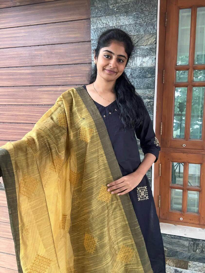 Our dying cotton kurta in black , all over embroidery work. black cotton bottom stitch with side buttons. Paired with beautiful bhagalpur silk thread work duppata