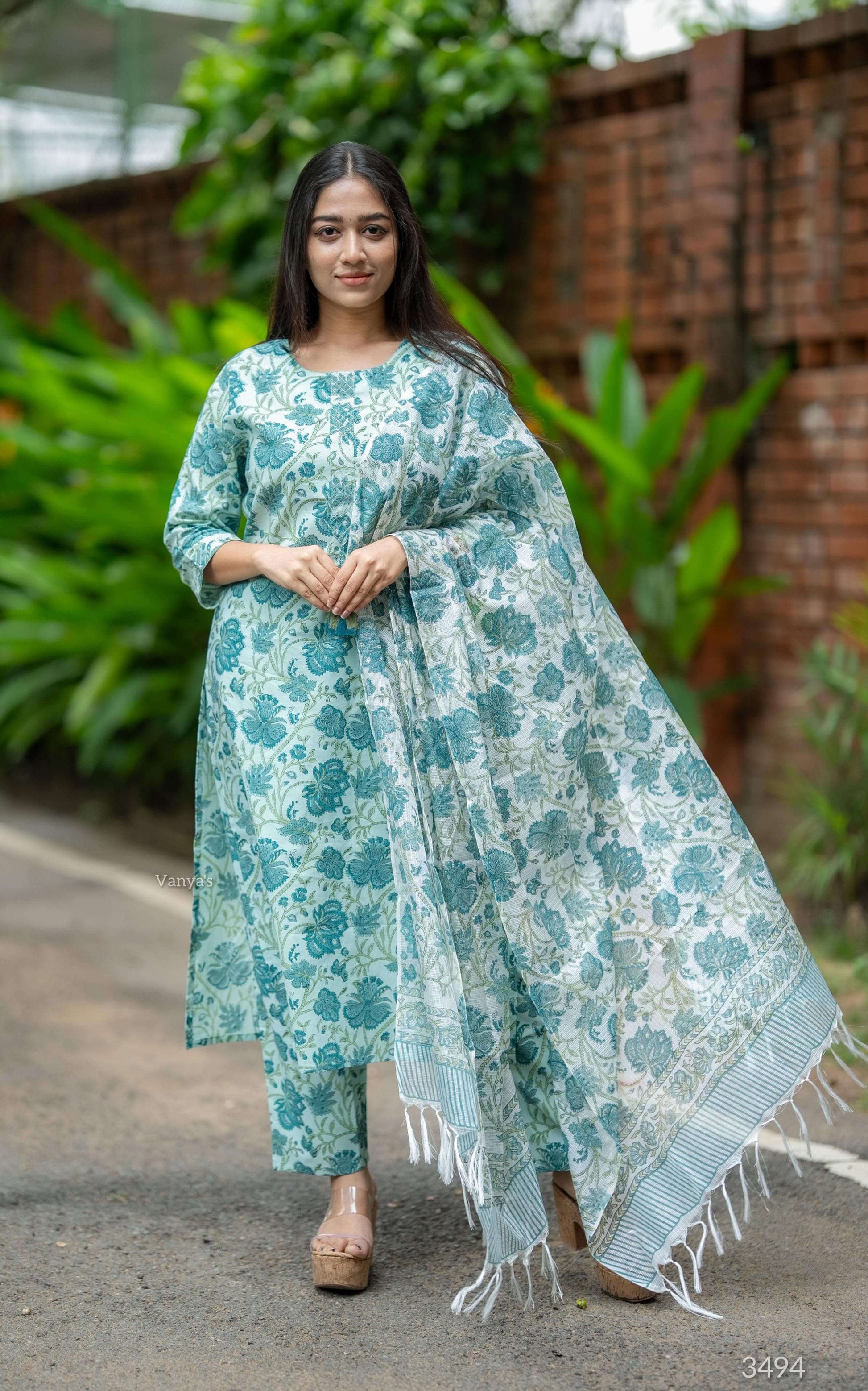 Beautiful cotton hand block printed salwar suit. The fabric is adorned with intricate circular patterns in shades of sea blue colour. The matching dupatta features elegant designs complementing the suit's print. The outfit is paired with straight-fit hand block pants. This comfortable and stylish salwar suit is perfect for casual wear or festive occasions..