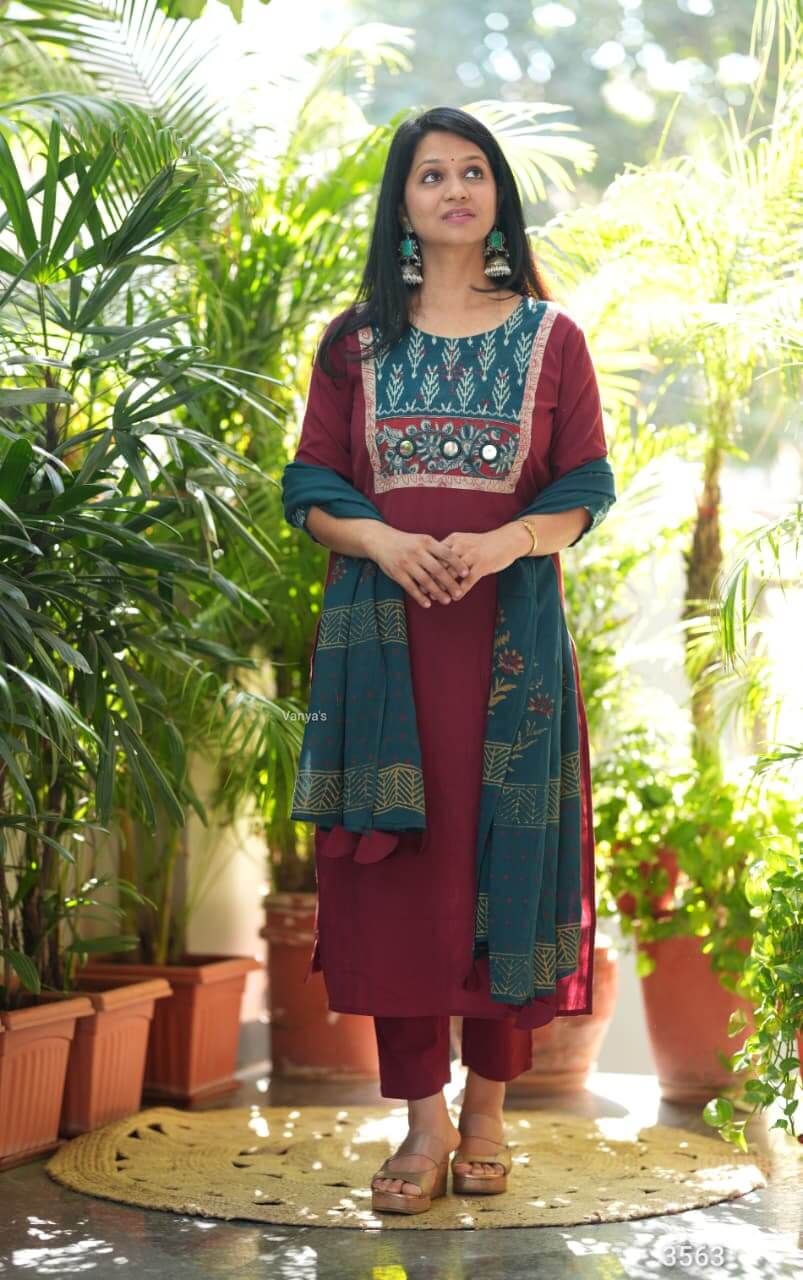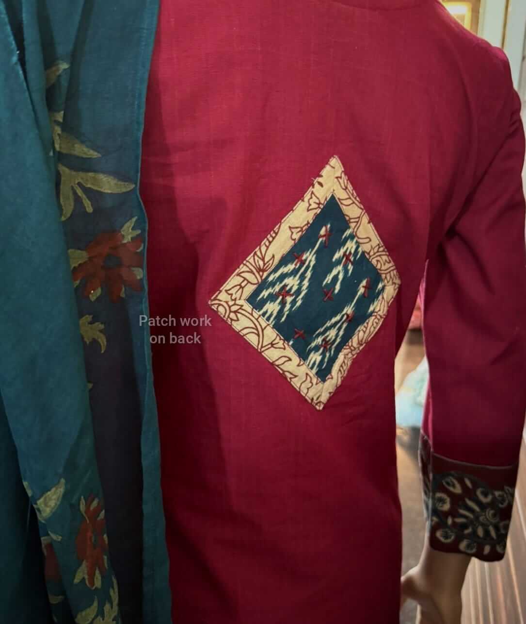The kurta set features timeless Indian craftsmanship with vibrant tones, an elaborately hand block patch and mirror work on yoke, and a contrast cotton mul dupatta with ethnic block print.