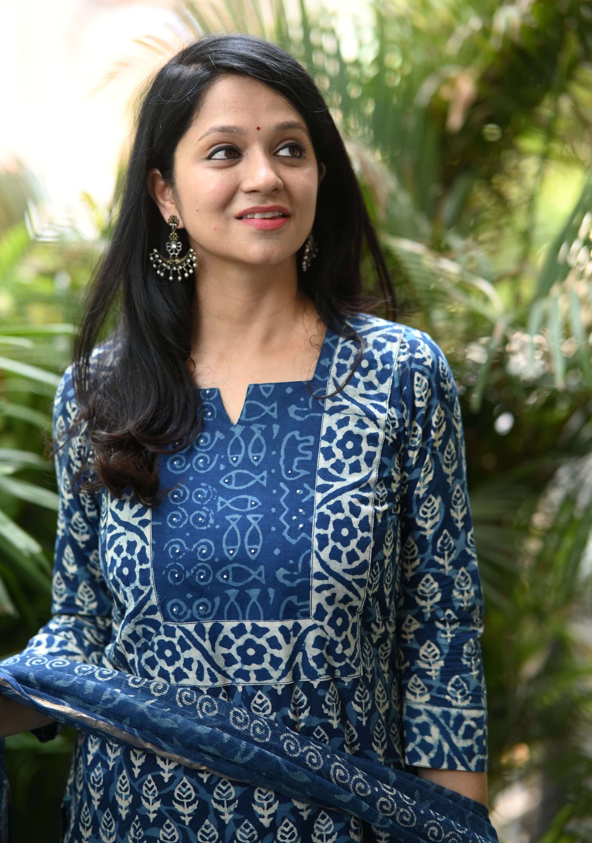 A captivating Bagru hand block printed suit set in deep indigo blue, crafted from soft cotton fabric, featuring traditional patterns for a timeless and elegant look.