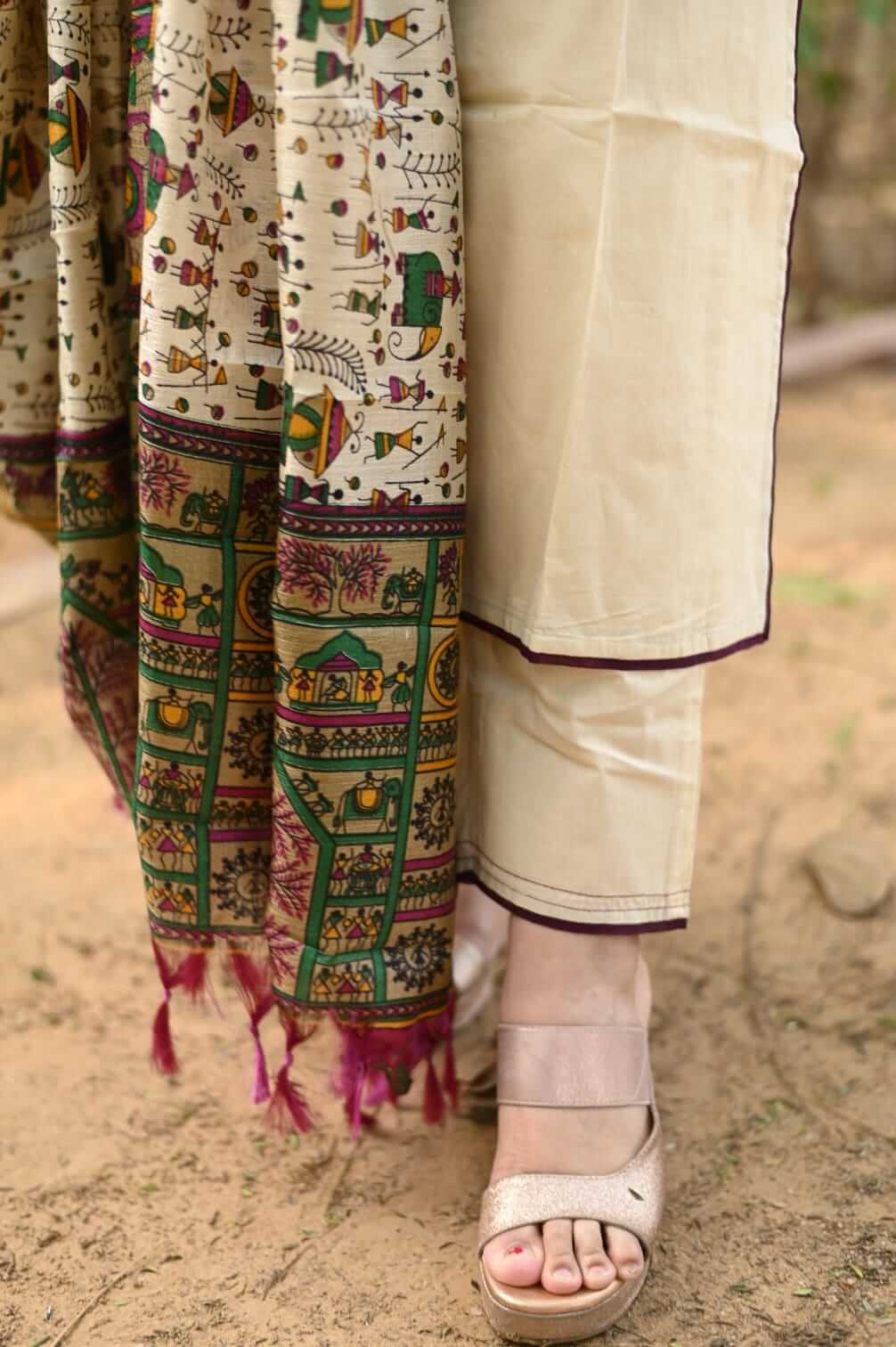 Cotton cream veg kurta adorned with zari elephant motifs...with pant and warli print khadi silk dupatta