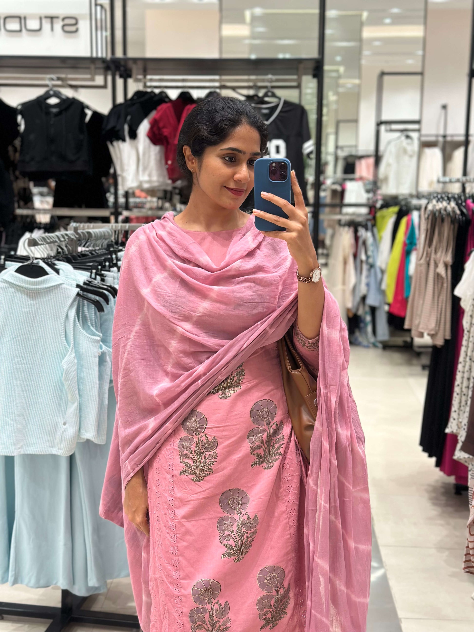 Our pastel mauve and hand block printed schifflie patch suit set is everything you need from an outfit!