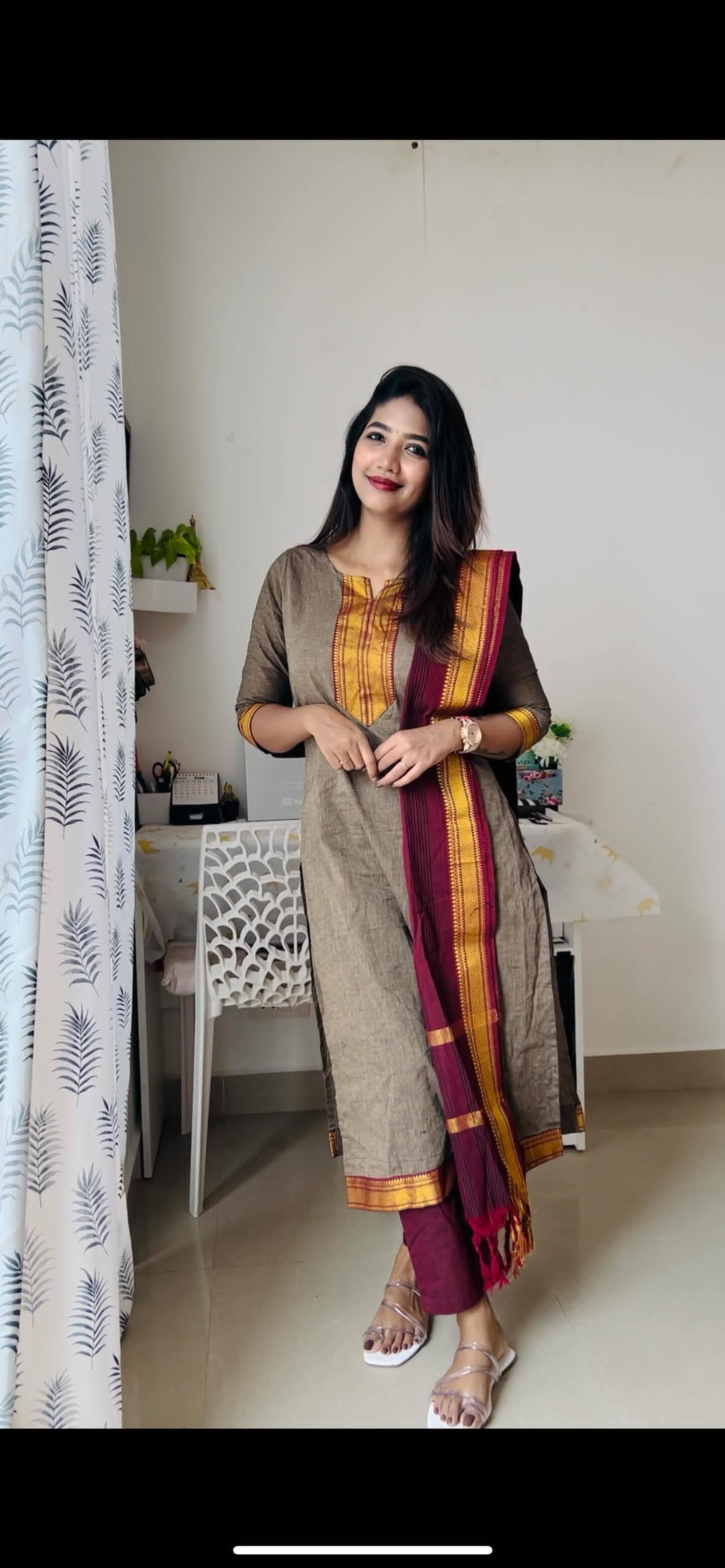 You will be so much in love with this *south handloom outfit* for combinations of golden self zari border self thread handloom south cotton kurta