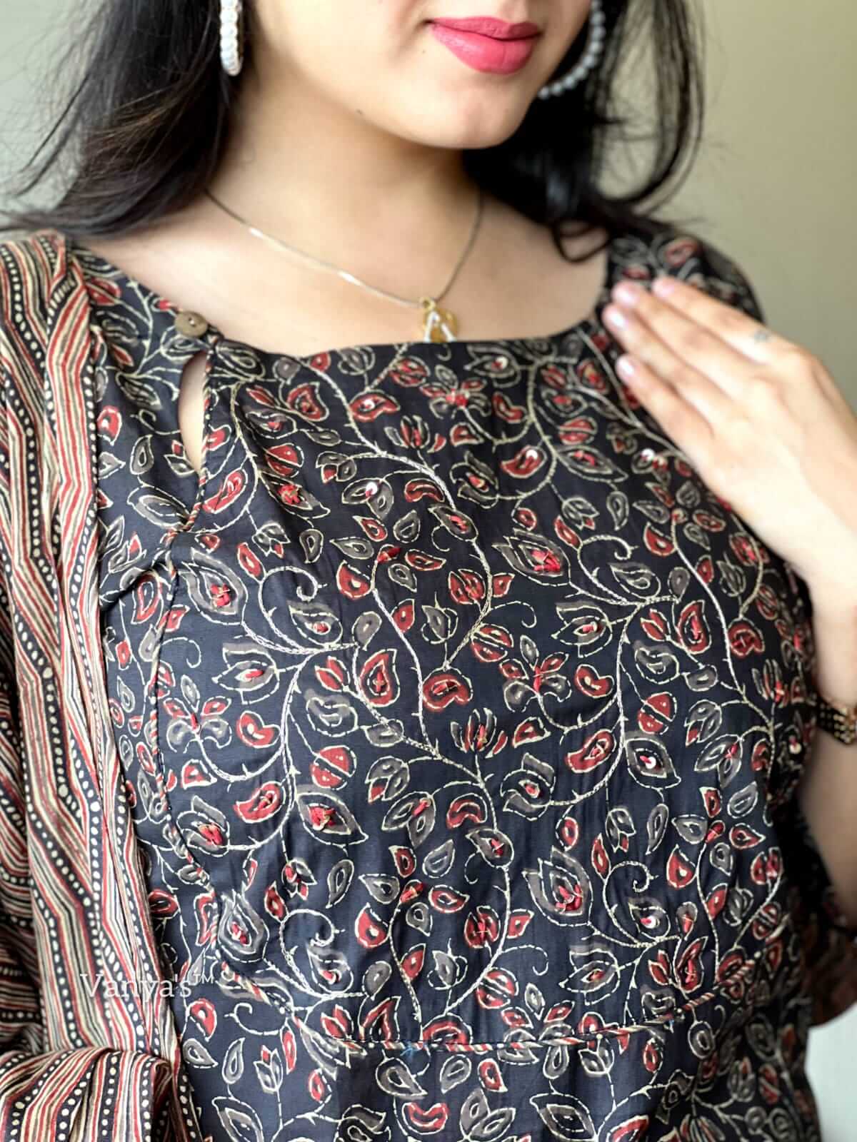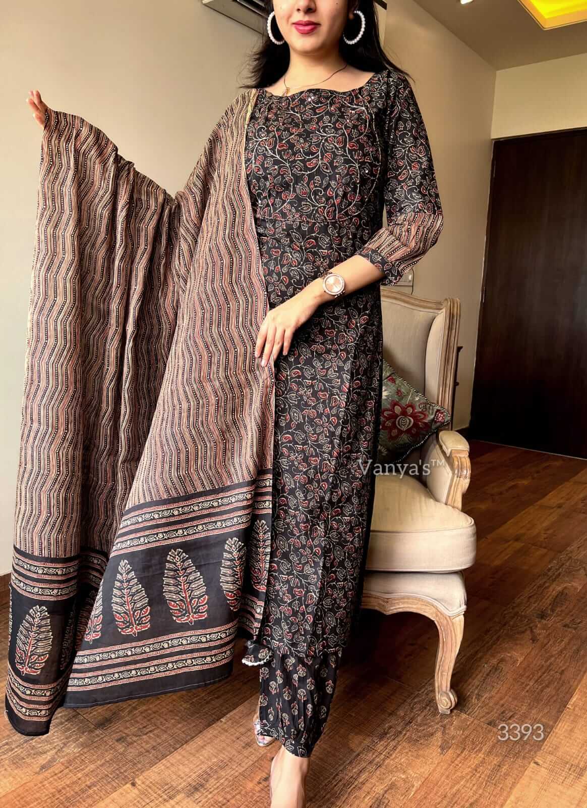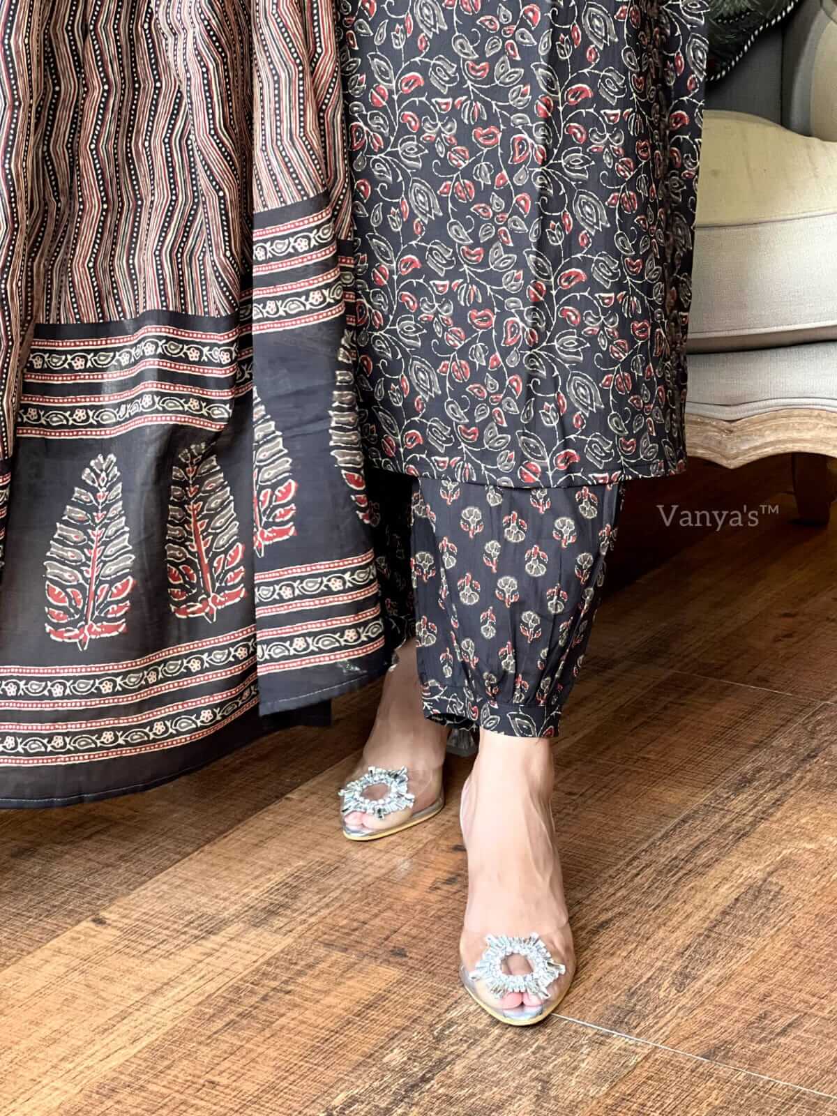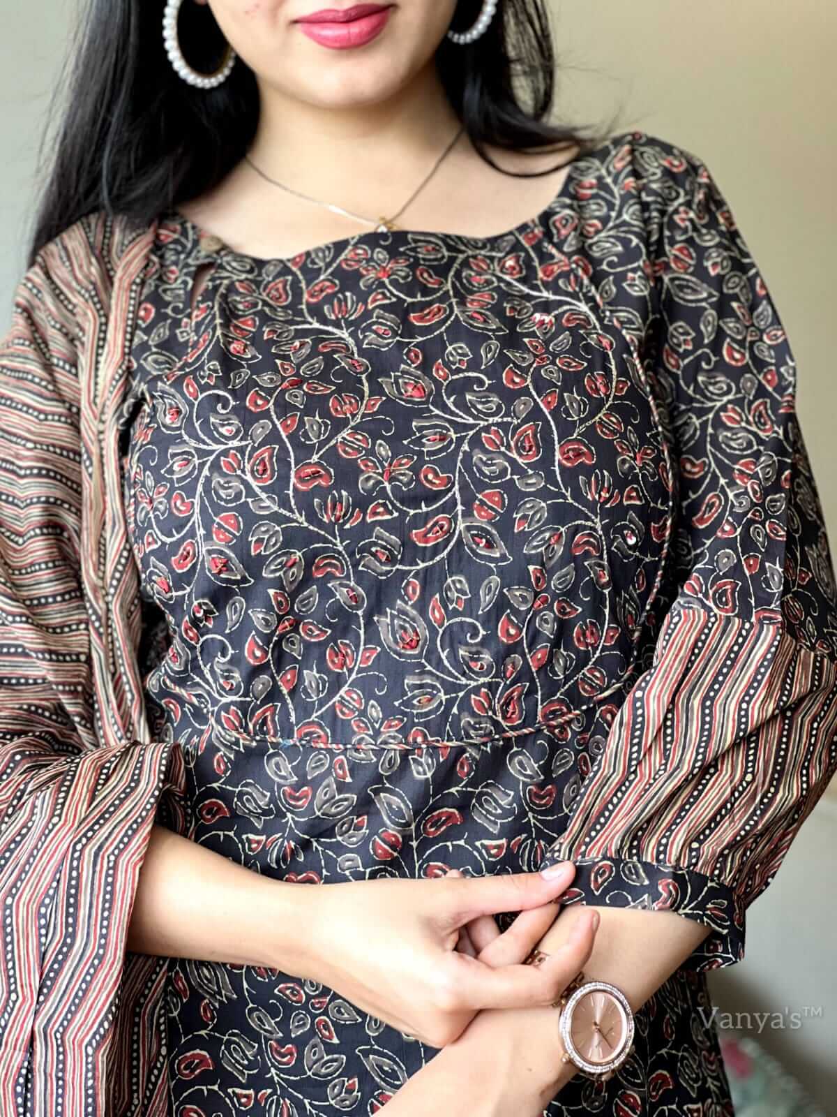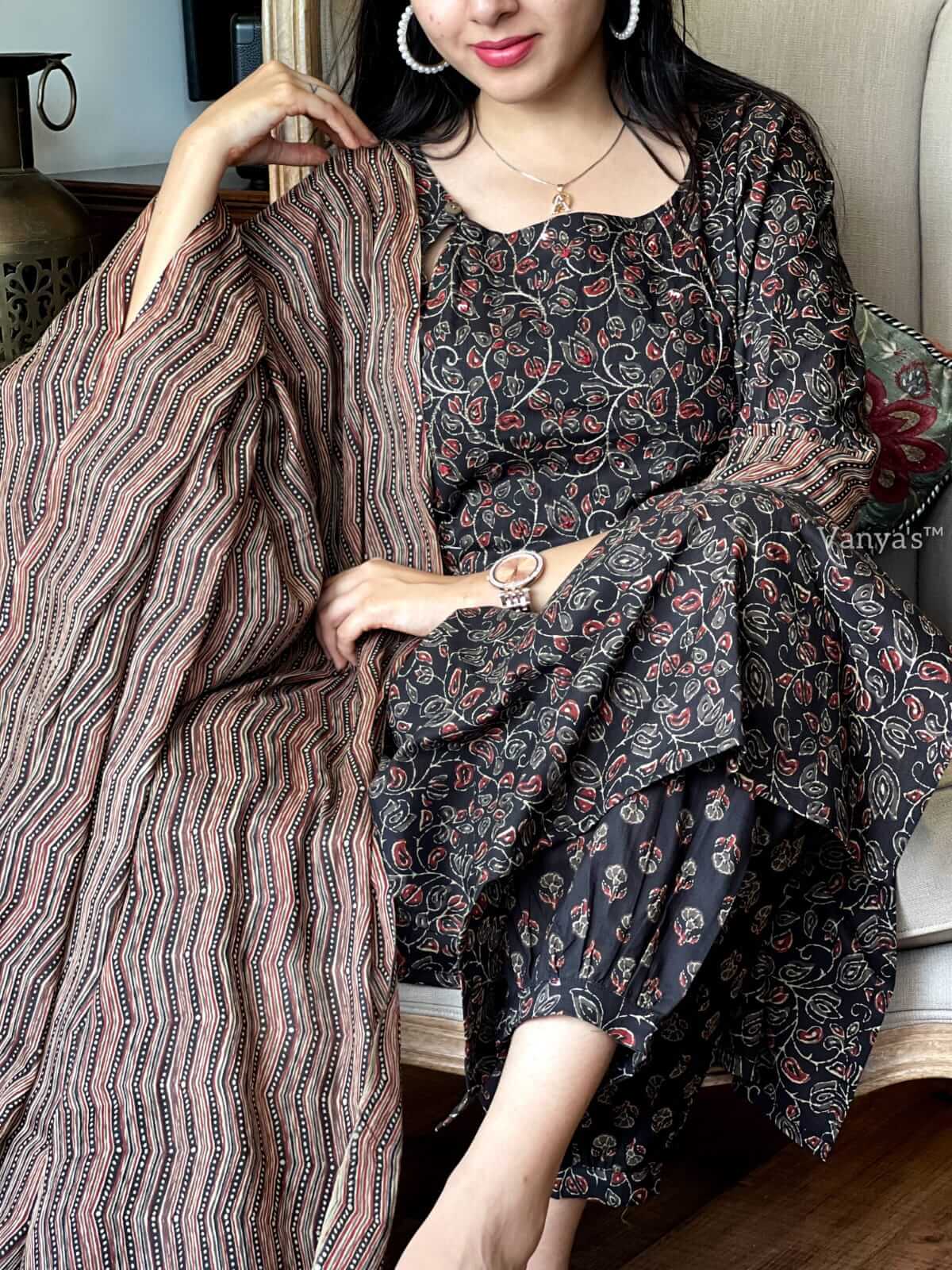 Beautiful three piece suit in our traditional ajrak printed cotton kurti pant duppata set. Beautifully crafted in traditional print
