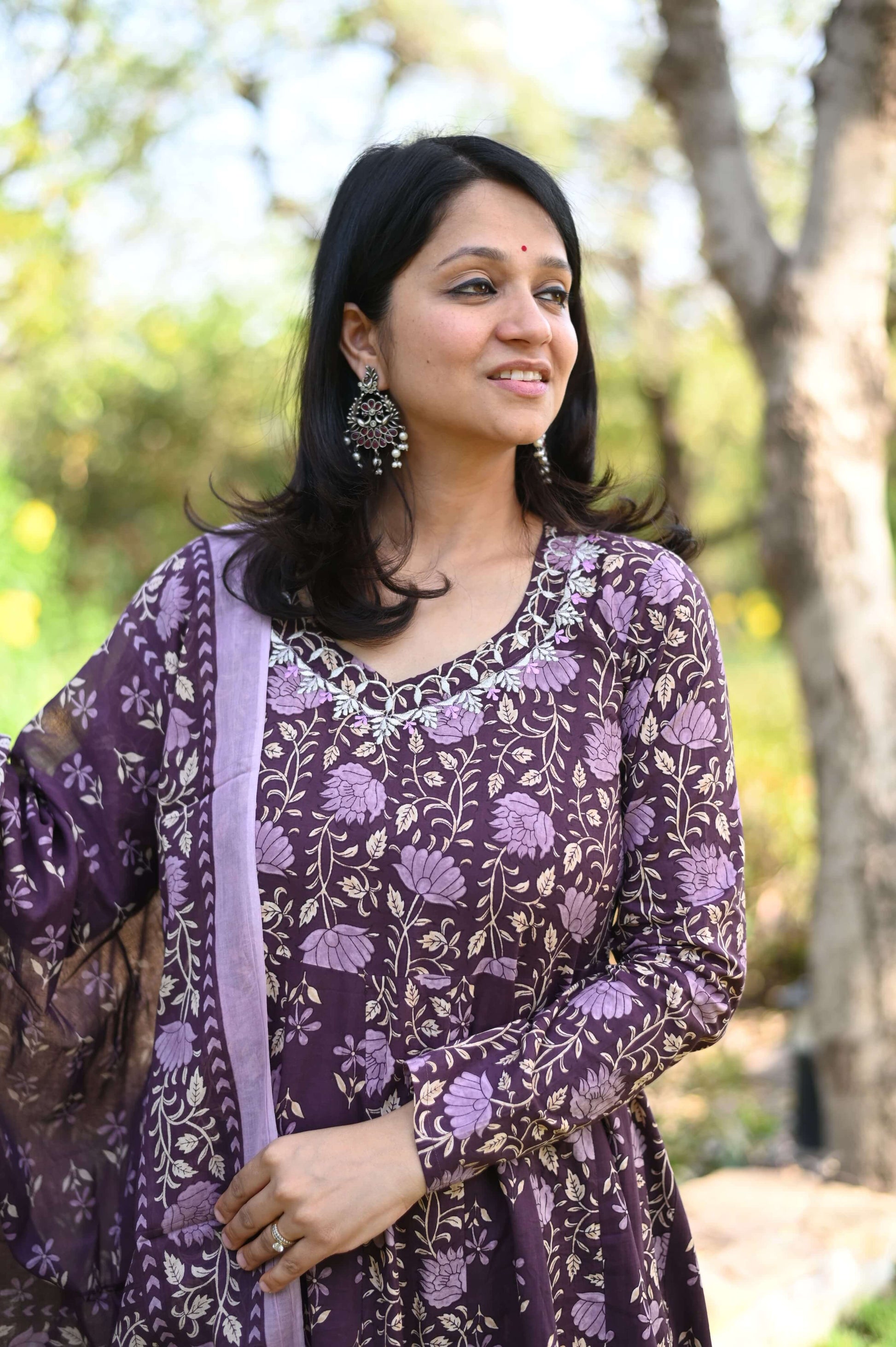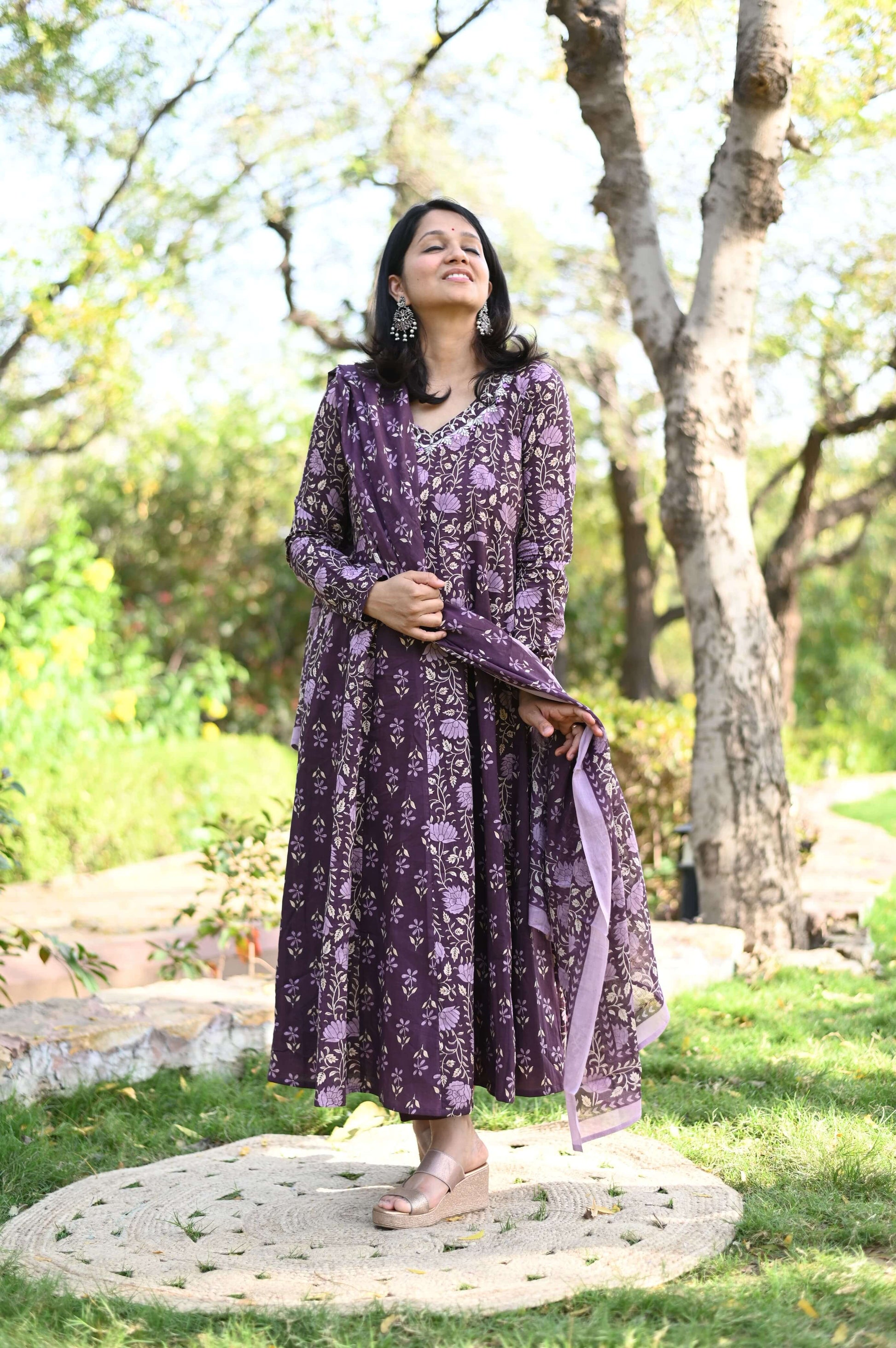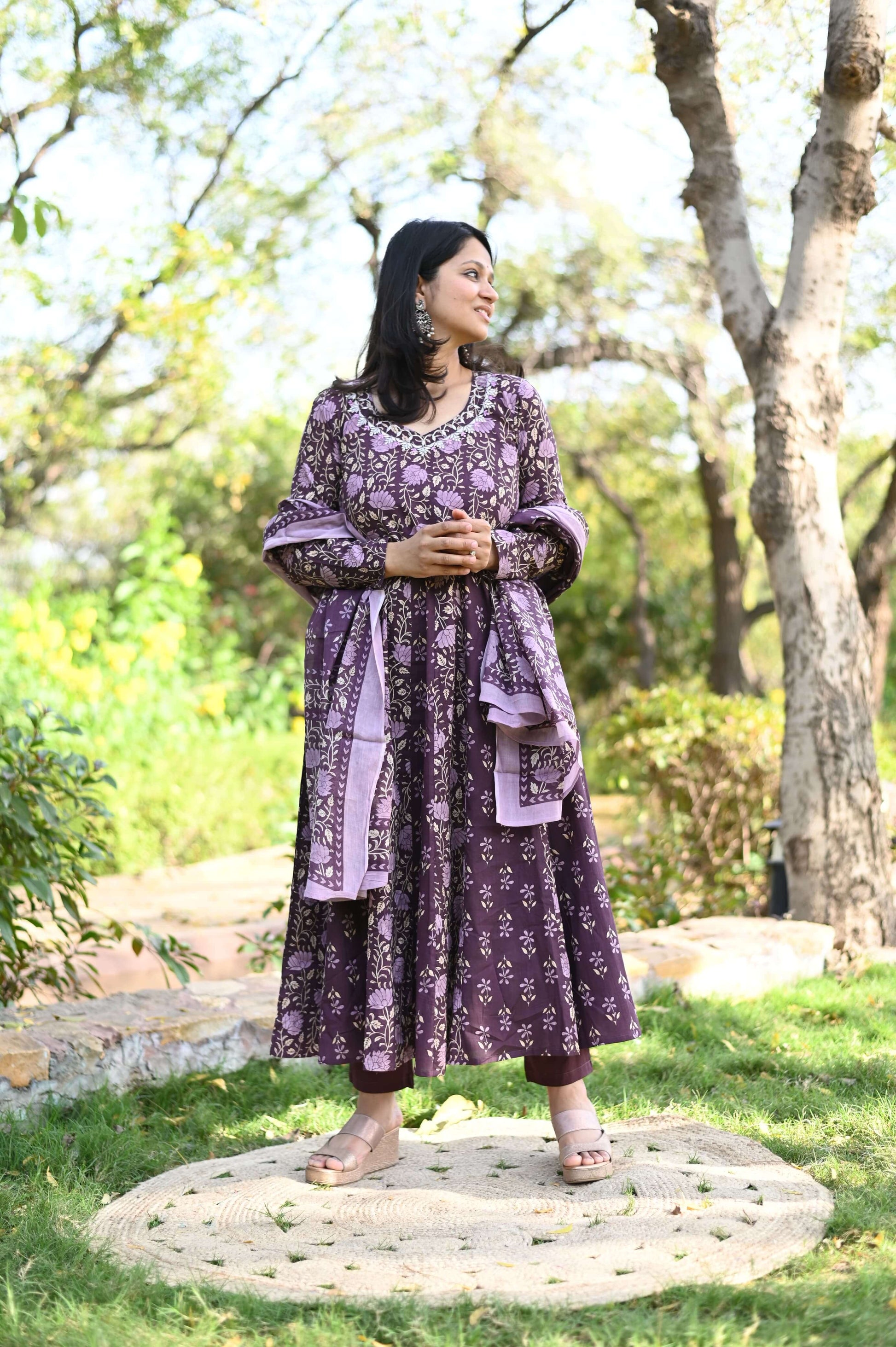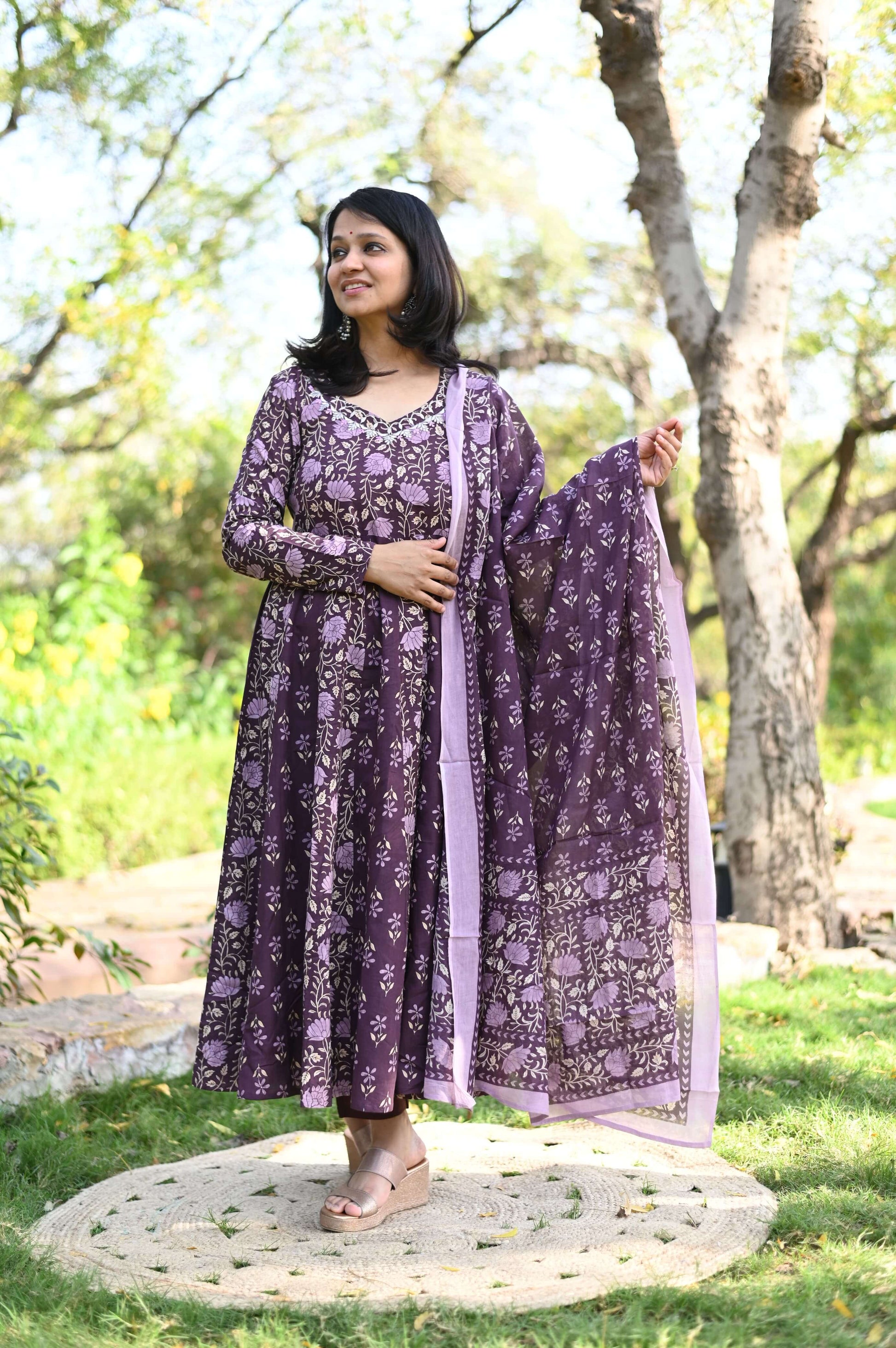 Unleash your summer spirit with our new launch double print handblock Anarkali suit set... minimalist zari embroidery on neck...