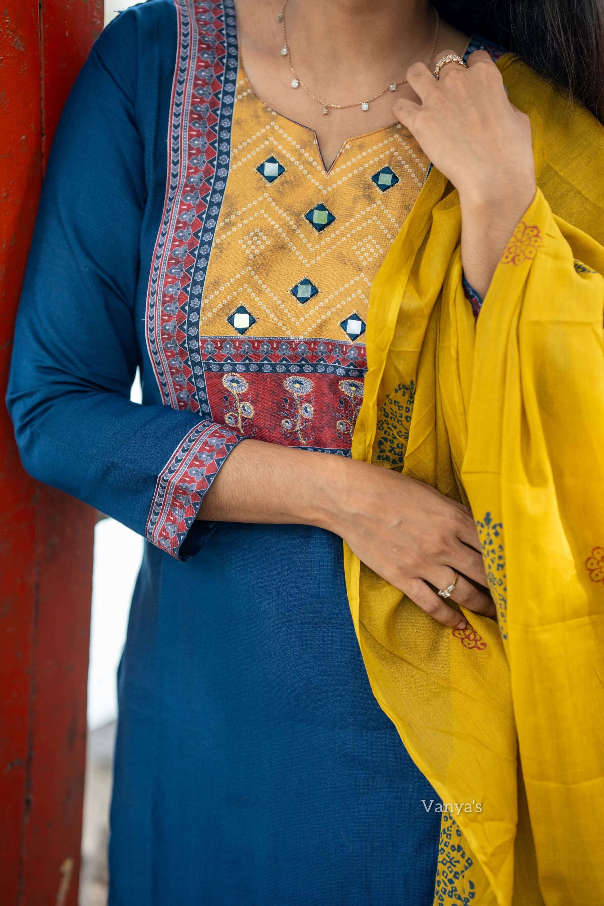 The Nivea Blue and mustard yellow Charm Suit Set radiates comfort and charm with its roual blue base and artistic detailing. The straight-fit *Handloom cotton* kurta is adorned with a striking hand patch yoke , intricate sleeve borders. Paired with matching blue pants and a contrasting mustard yellow mul cotton dupatta featuring delicate block prints.