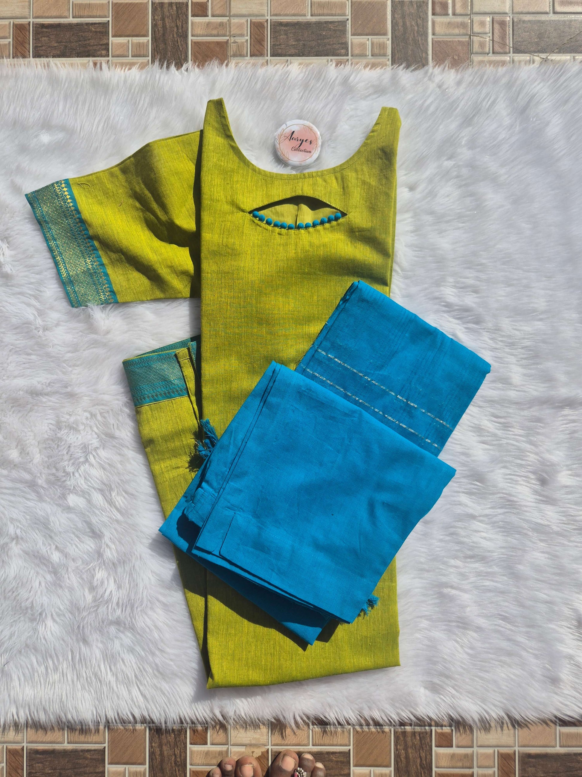 Pure South Cotton Handloom Border Kurta with Elegant Neck Detailing and Perfect Cotton Pant.