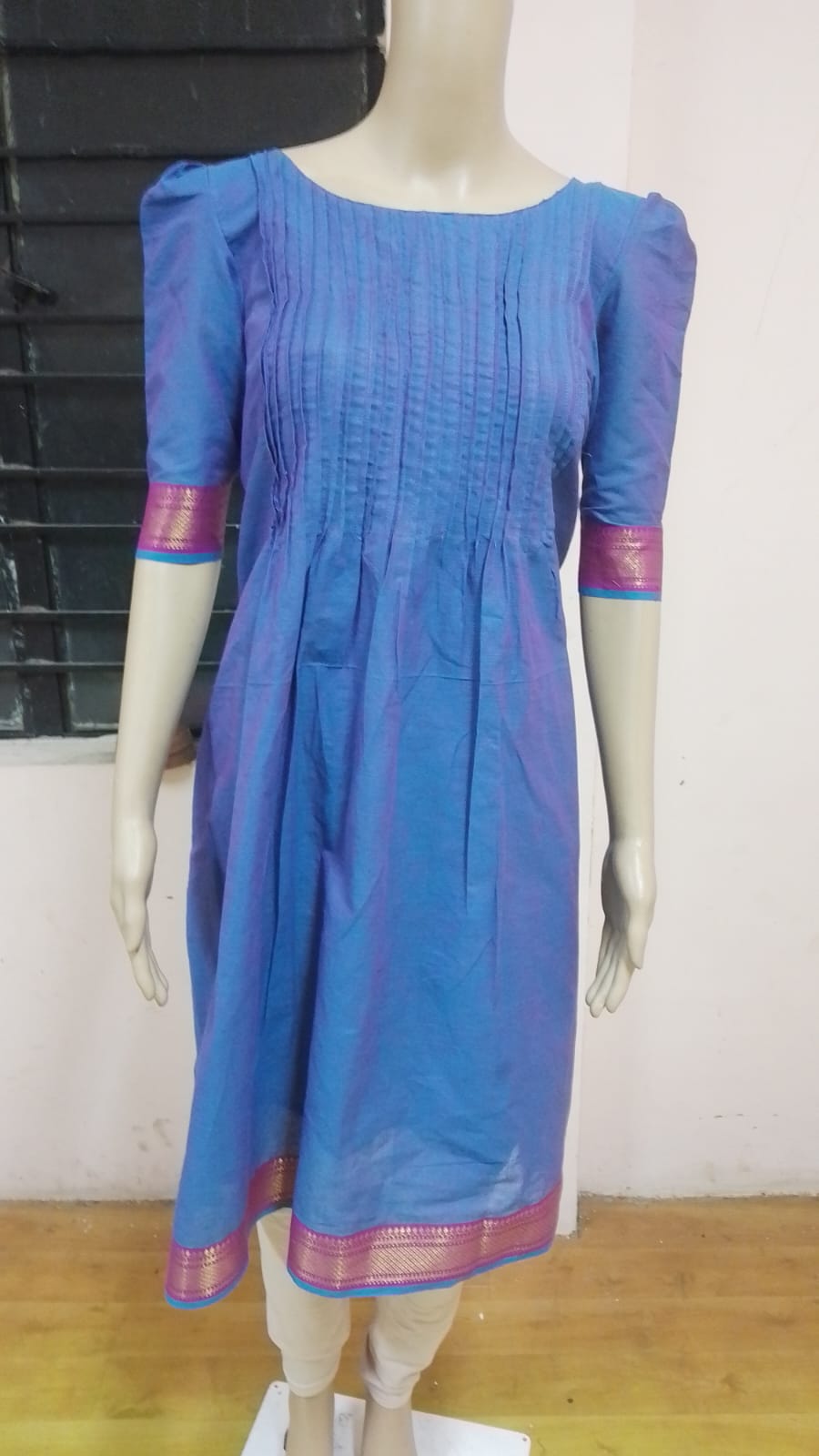 Mangalagiri cotton top with lining paired with skirt-style palazzo bottom with lining, giving a flowy and elegant look.
