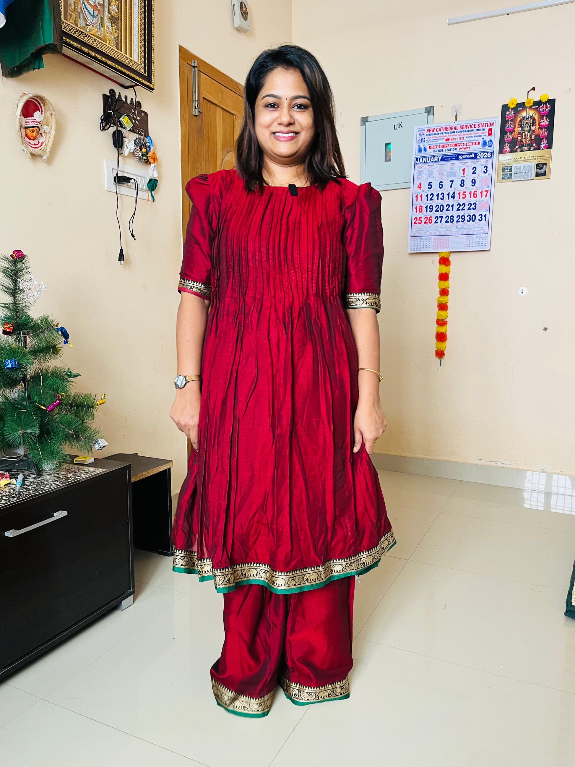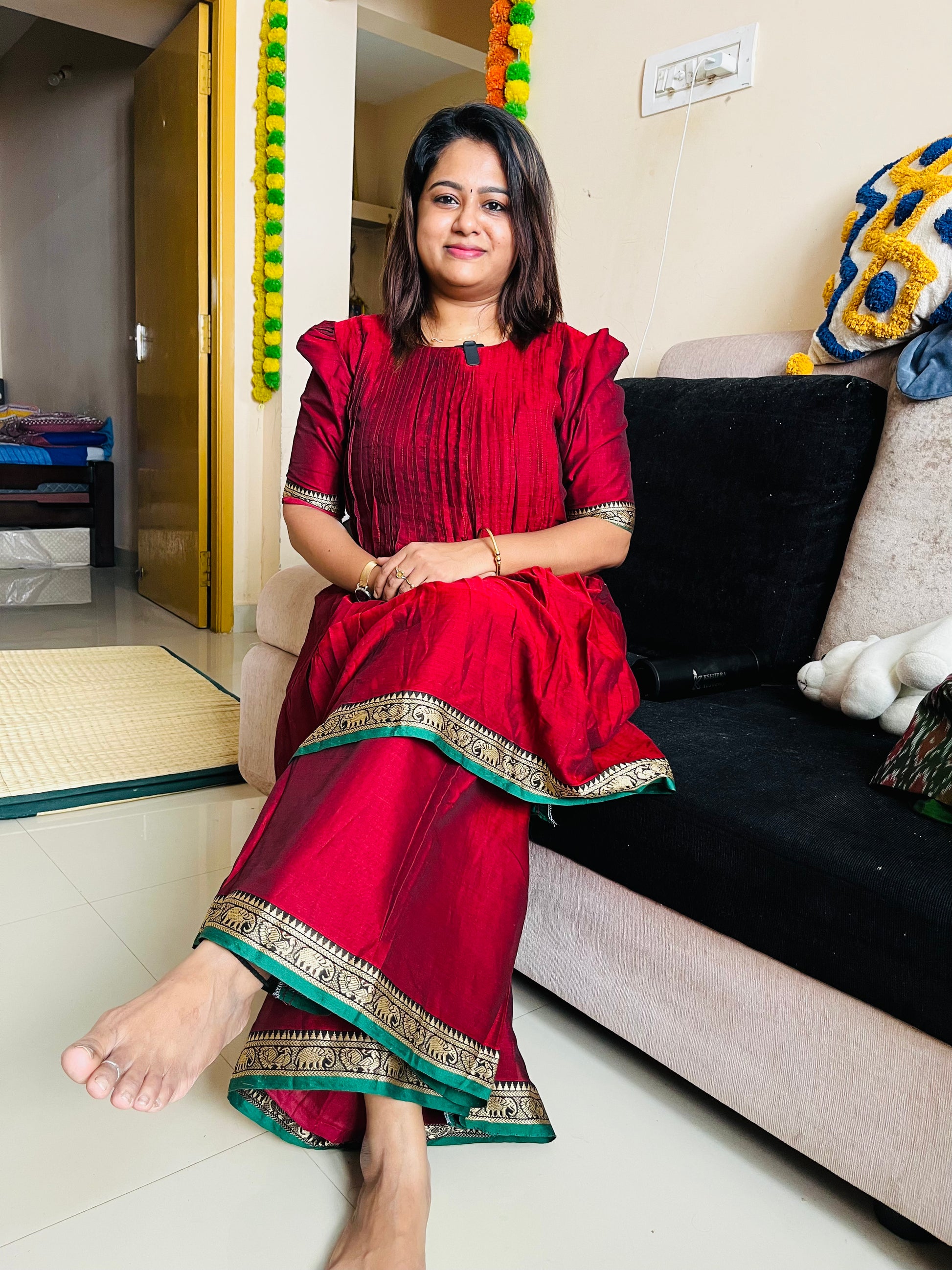Crafted in premium Narayanapet cotton, this elegant set features a top with lining paired with a skirt-style palazzo bottom with lining, creating a beautifully flowy and sophisticated silhouette.