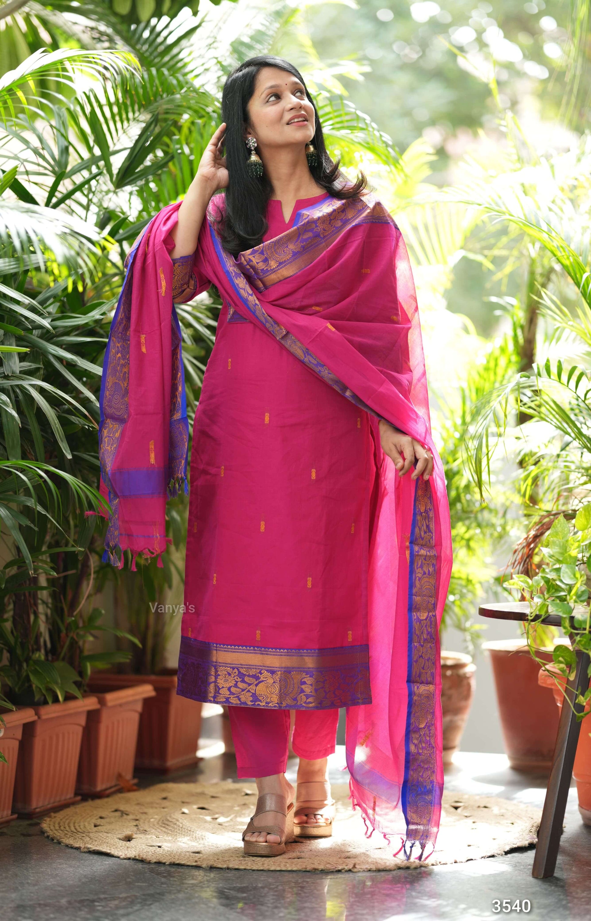 Step into timeless grace with Vrinda Raani pink Charm, The Rani pink kurta features exquisite woven zari-style detailing on the neckline, sleeves, and hem that adds a touch of luxury 🌟.