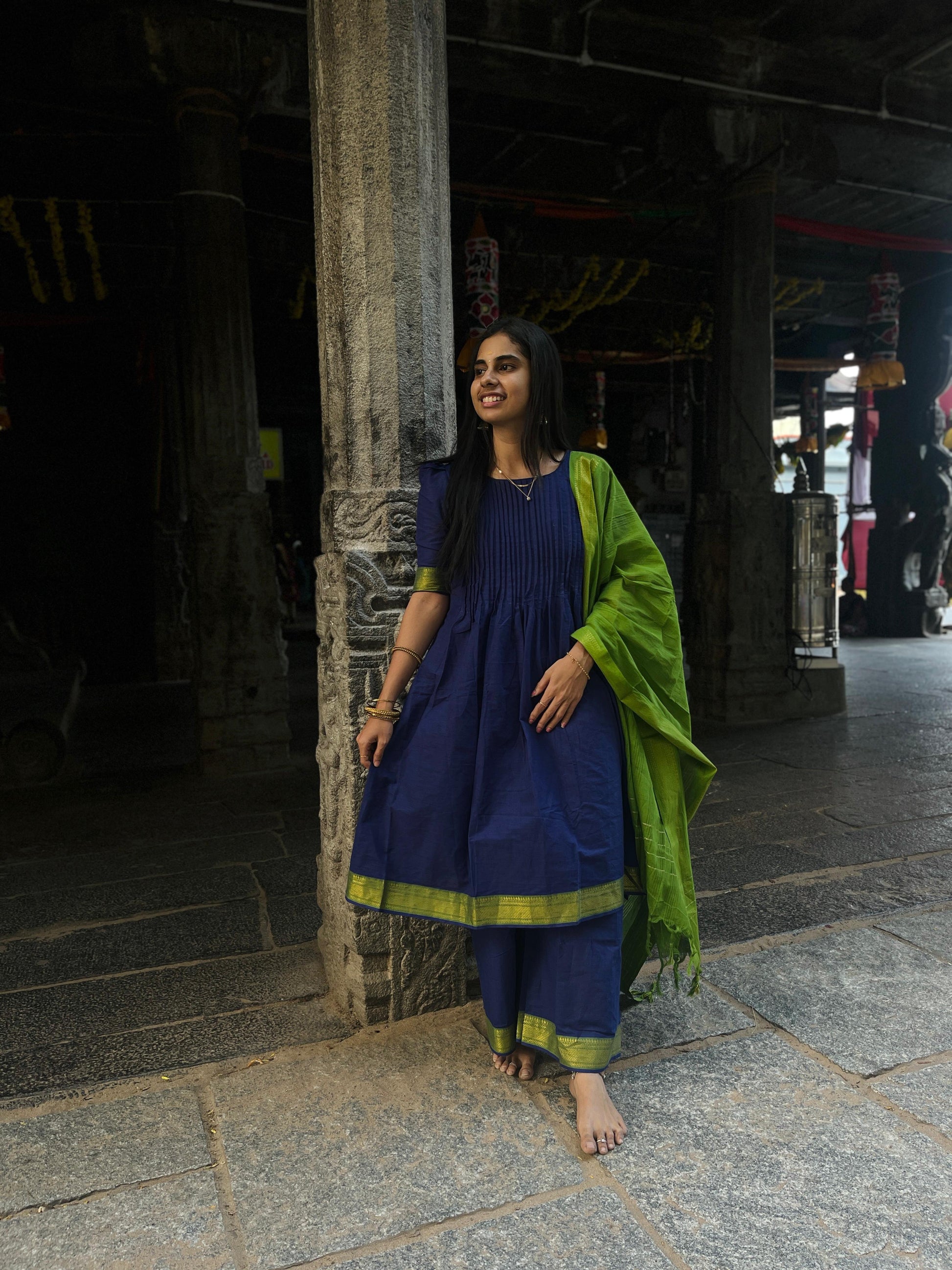 Crafted in premium Mangalagiri cotton, this elegant set features a top with lining paired with a skirt-style palazzo bottom with lining, creating a beautifully flowy and sophisticated silhouette.