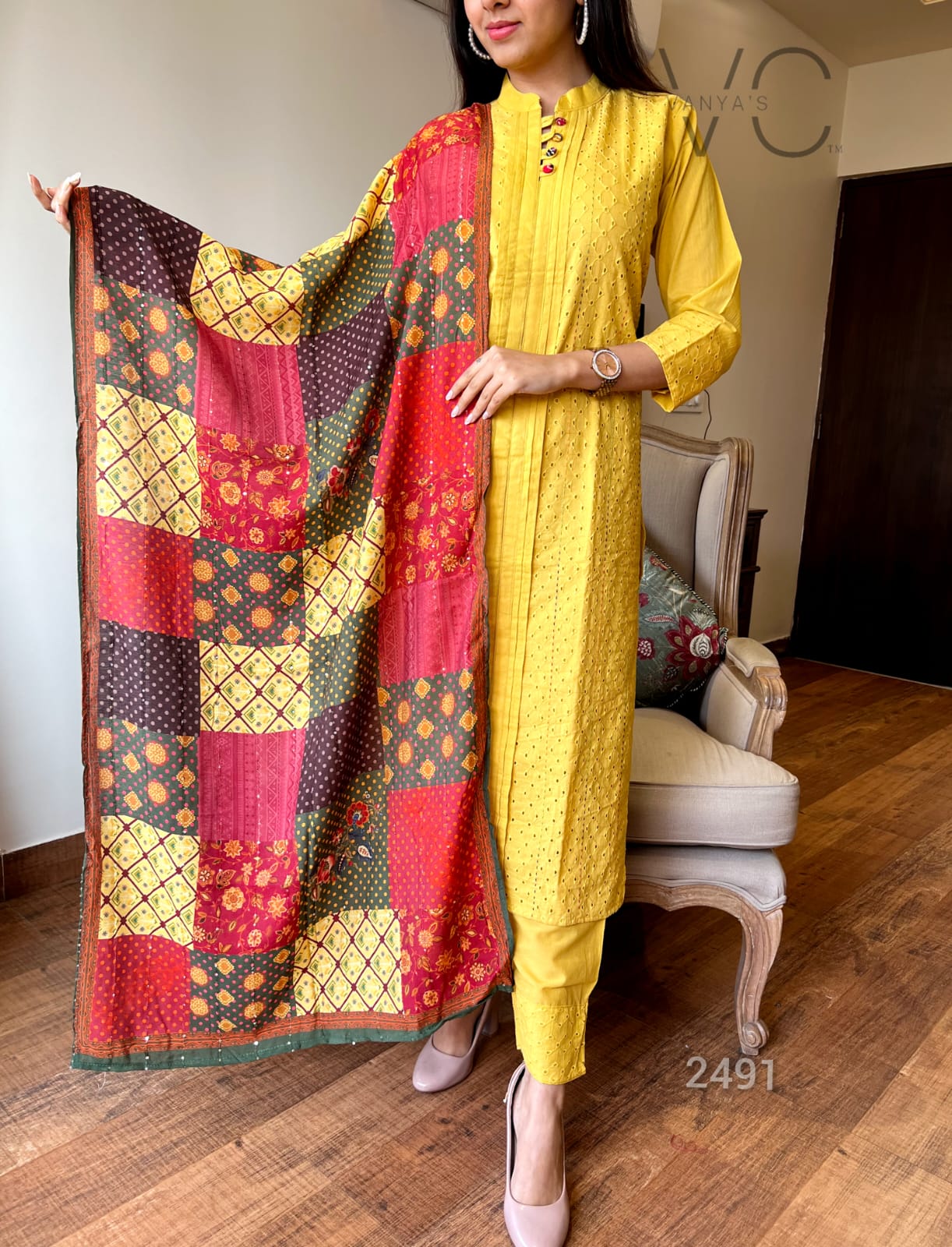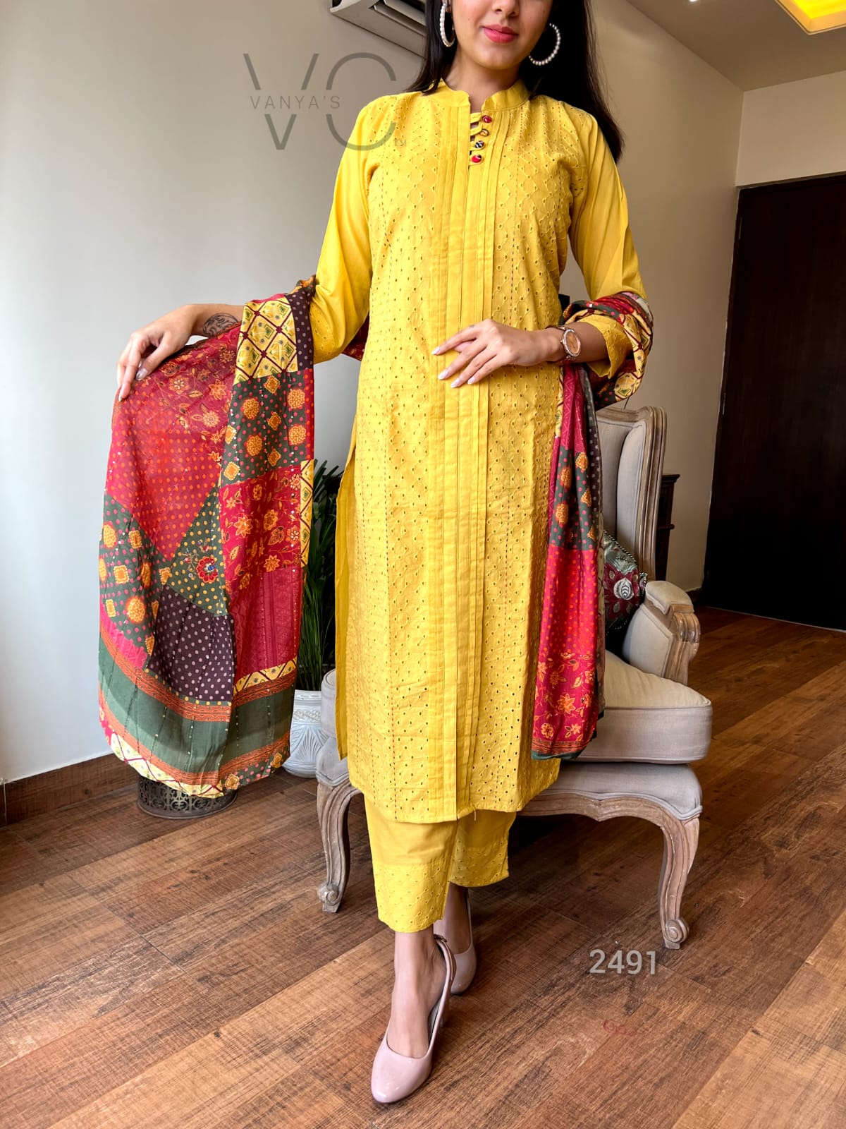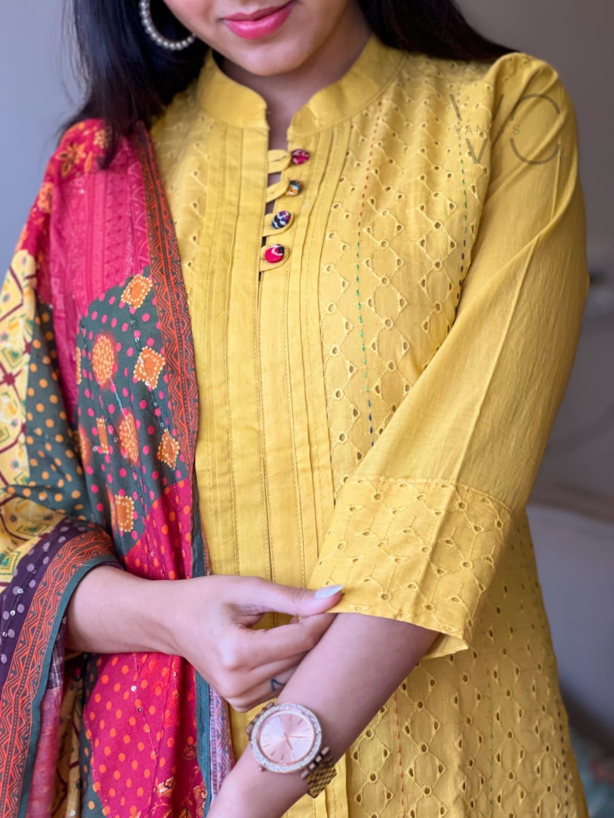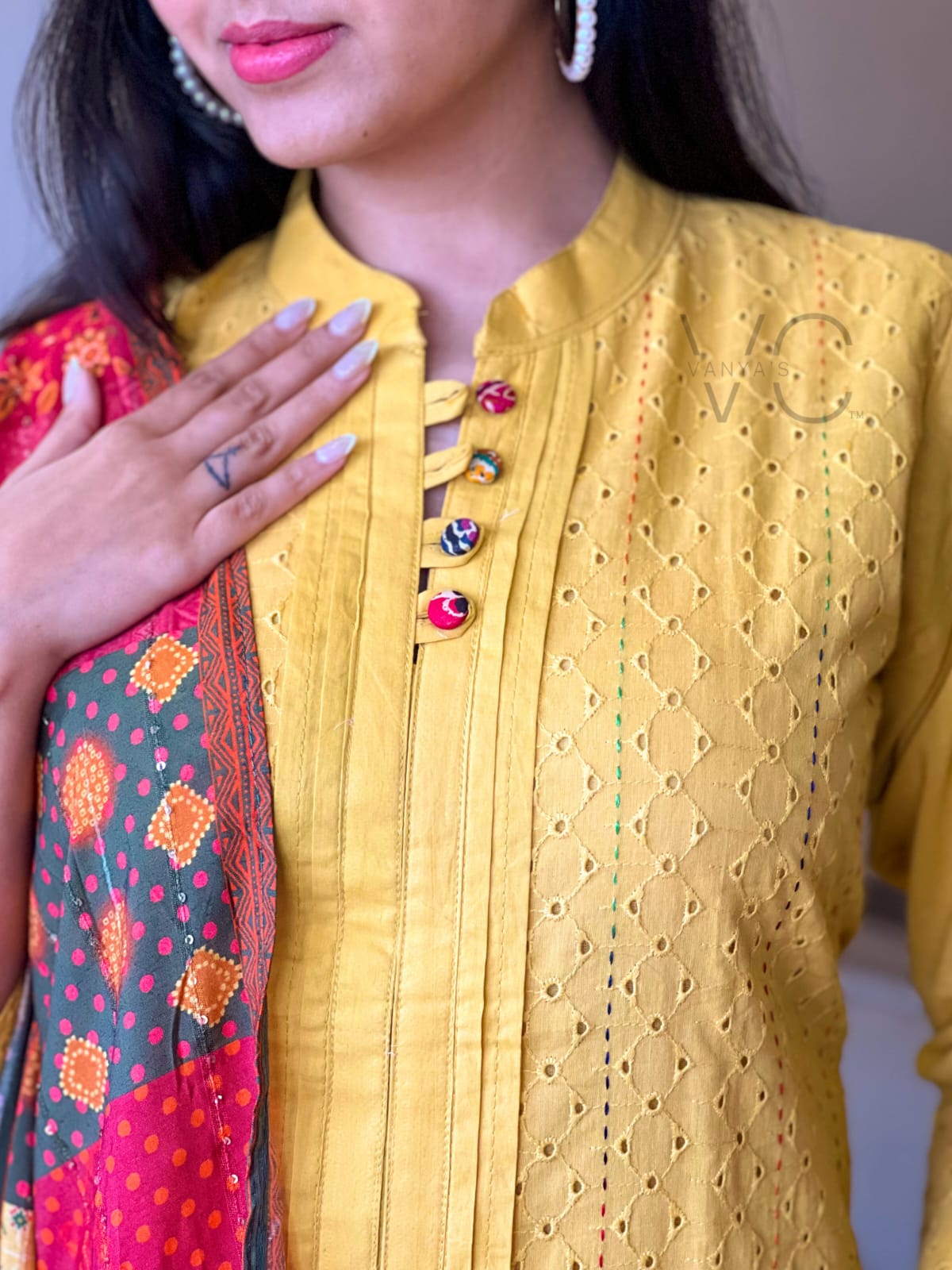 Yellow colour pure cotton schiffle chickan fabric high neck kurta . Enclosed with beautiful button. With cotton pant paired with muslin silk self sequence duppata