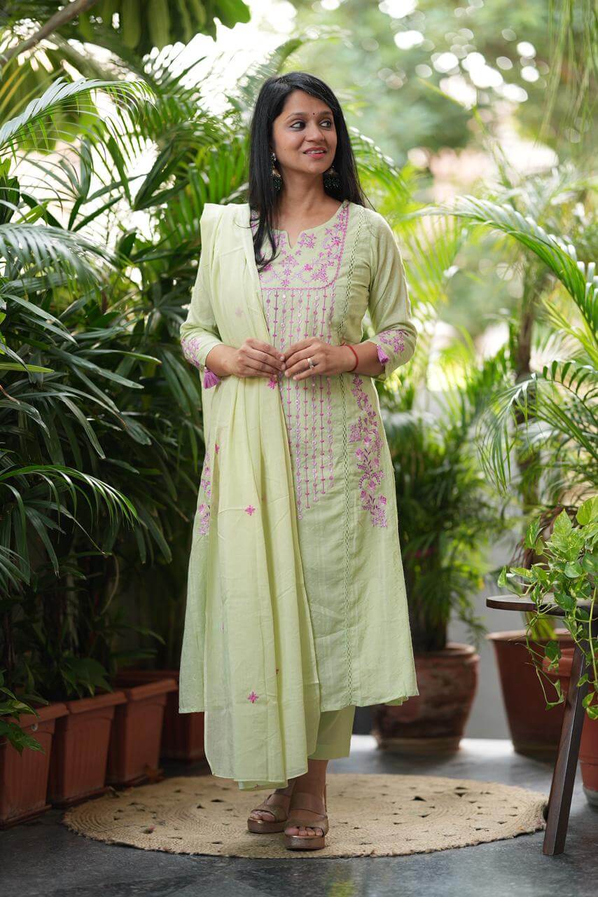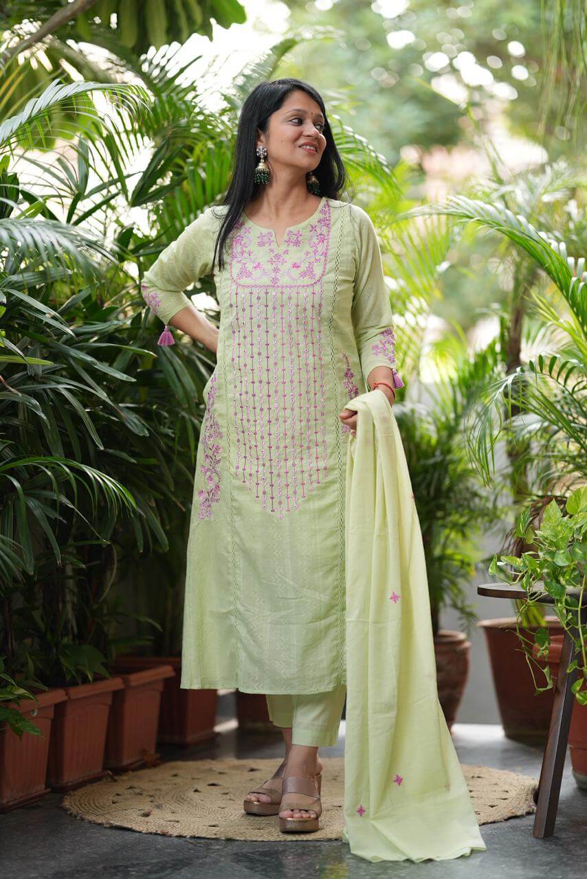A Premium collection in self embroidered cotton with cotton lining adorned with same colour Croatia detailing…. Heavy embroidery on Kurta… matching pants and matching embroidered Dupatta…