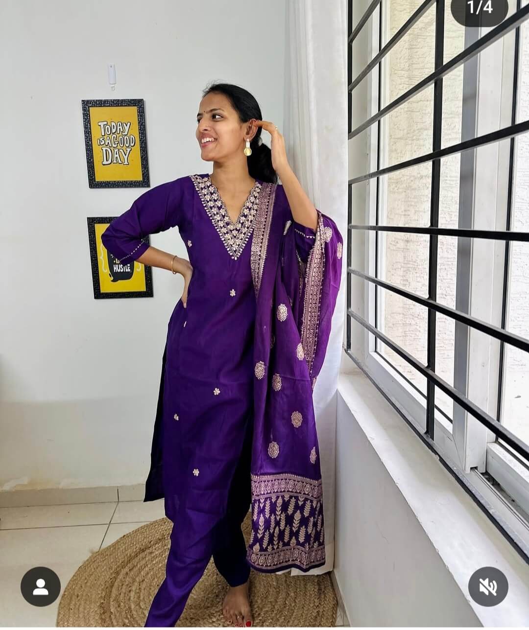 Look straight out of a dreamy movie set as you turn around and walk in this elegant roman silk (attached crepe inner) hand embroidery work suit.. the perfect blend of traditional wear and chic design.