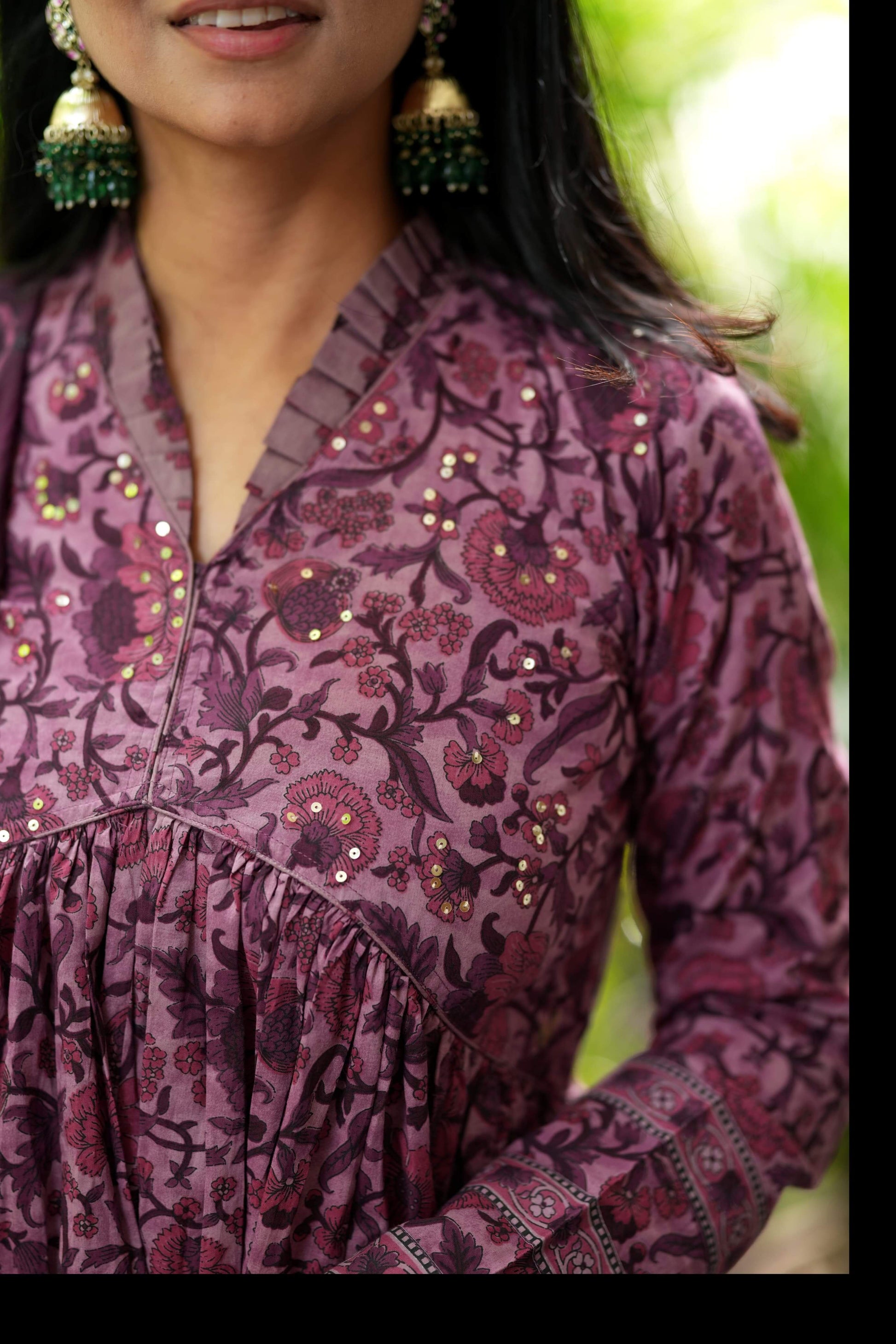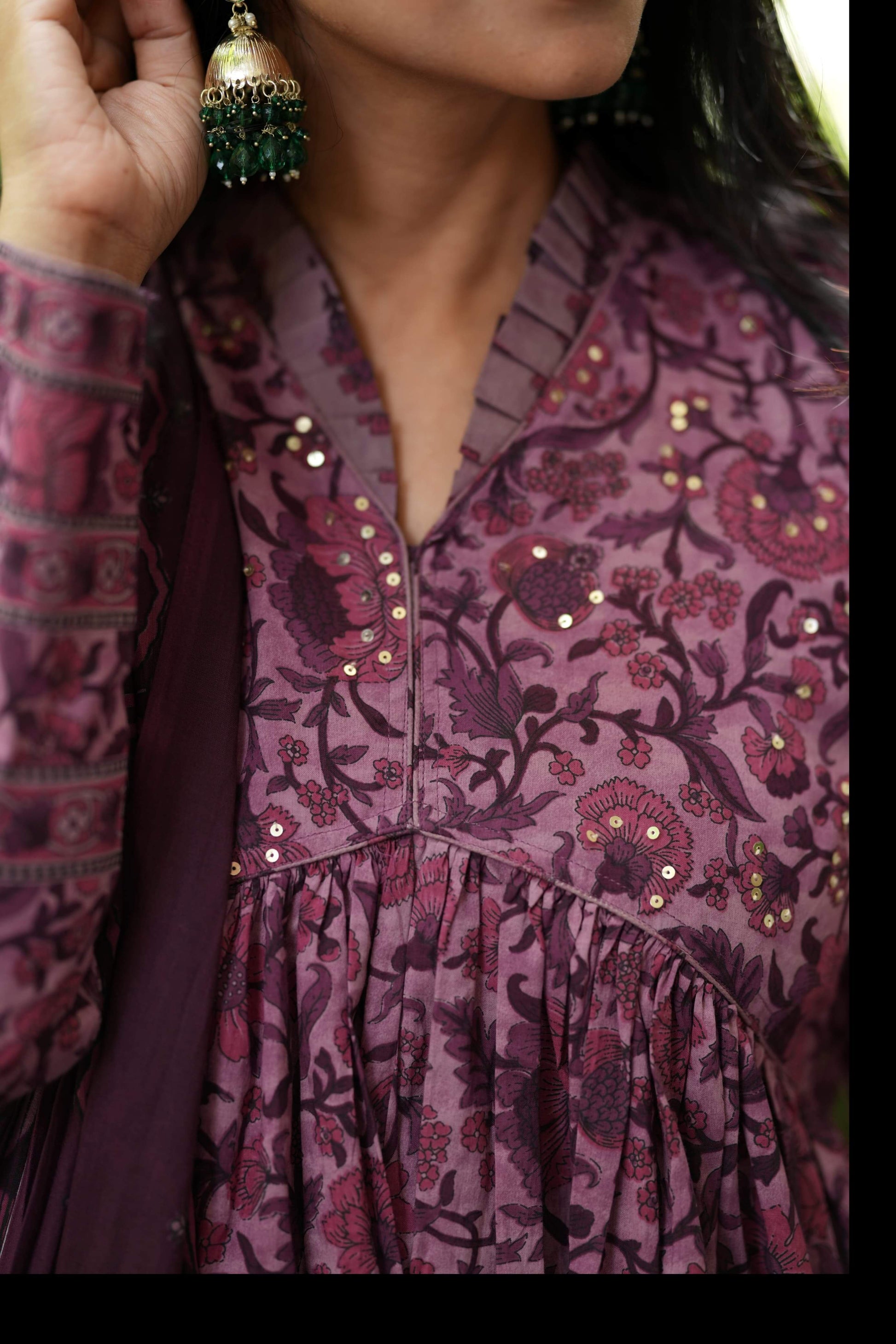 The Sunidhi Bagru print Alia Anarkali Set is a mesmerizing blend of elegance and craftsmanship. Made from pure cotton, this flowy Anarkali features intricate floral bagru texture prints.Paired with a delicate bagru mul mul dupatta, this outfit is a perfect fusion of comfort and tradition.