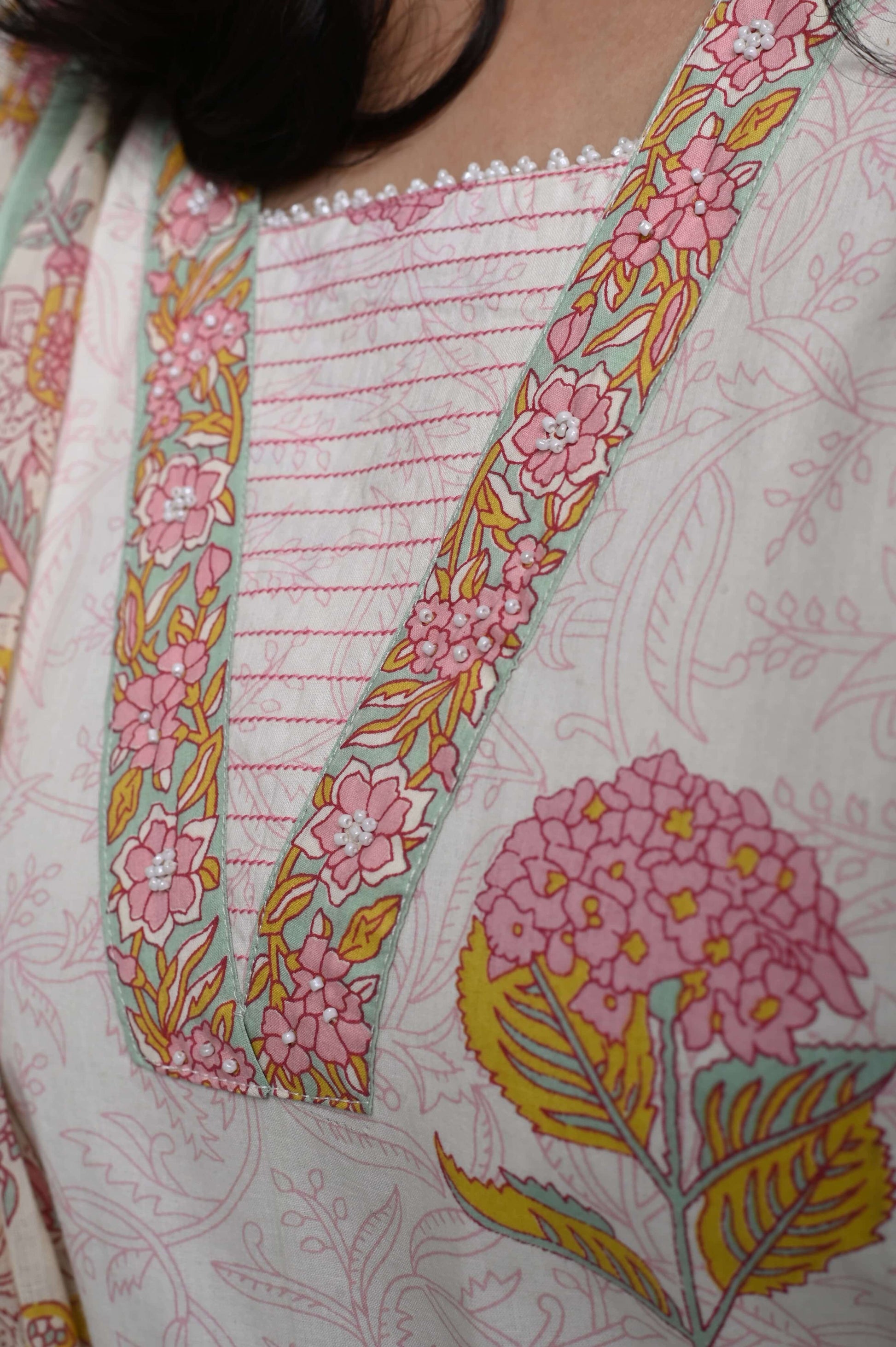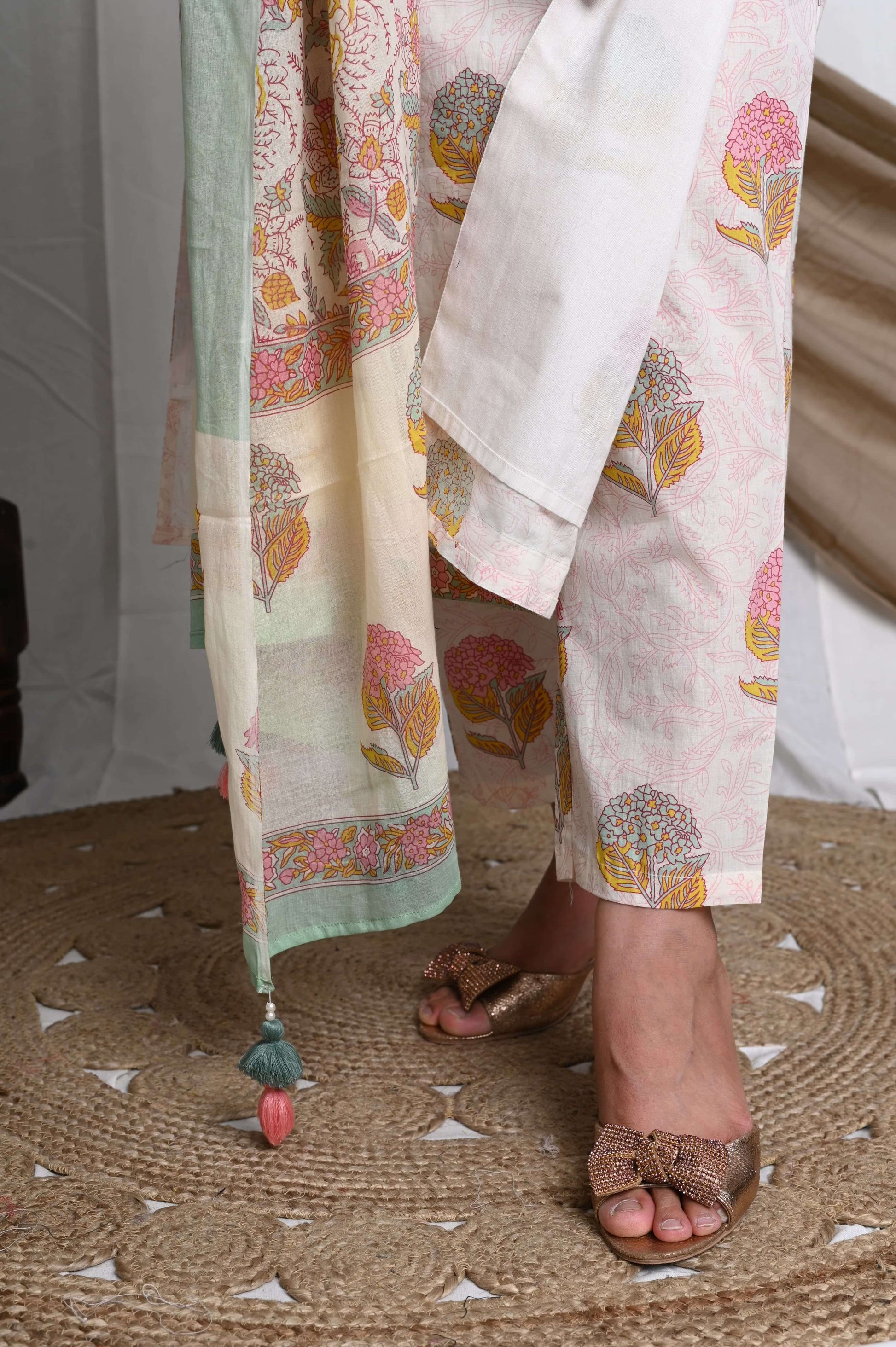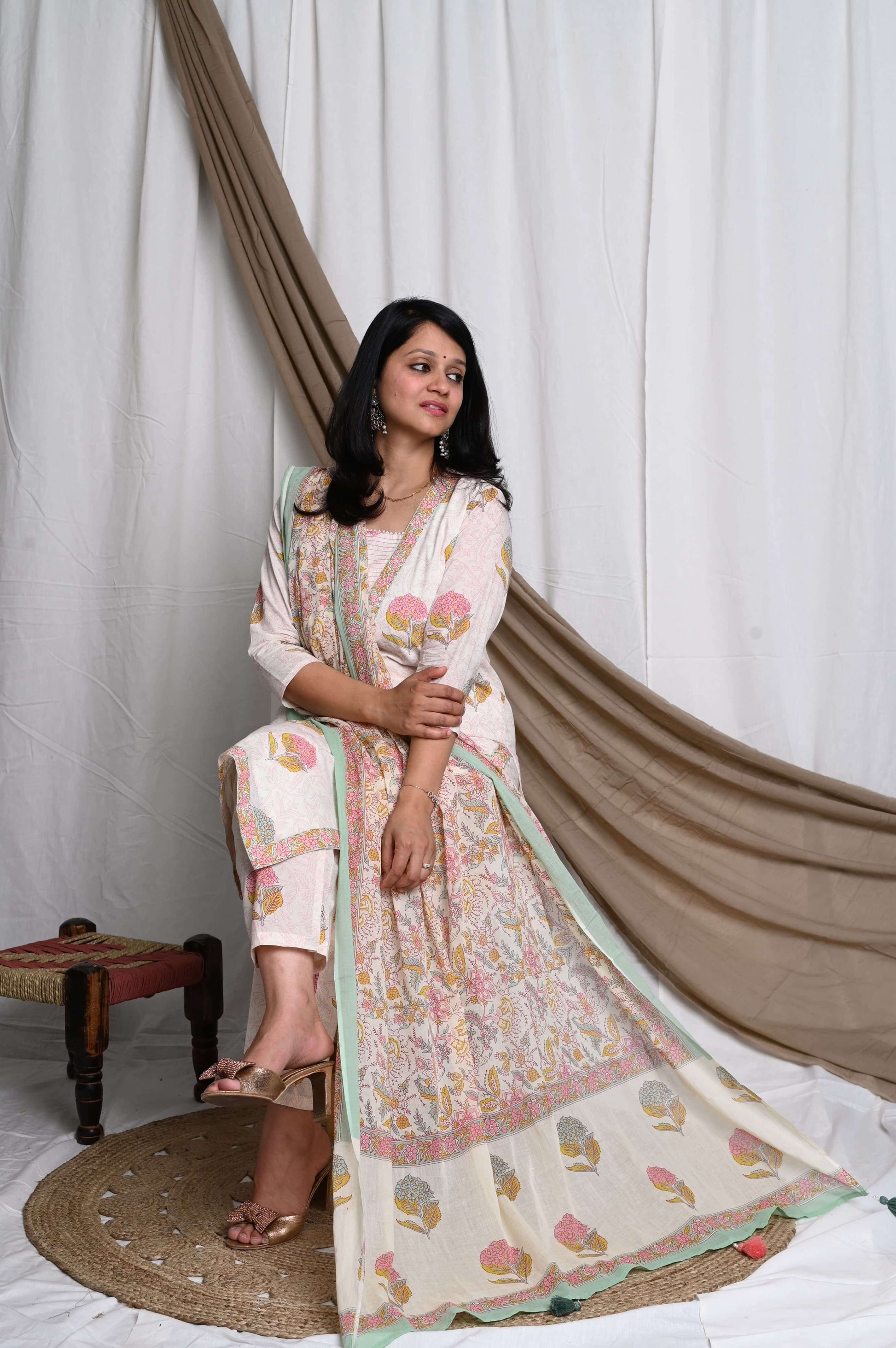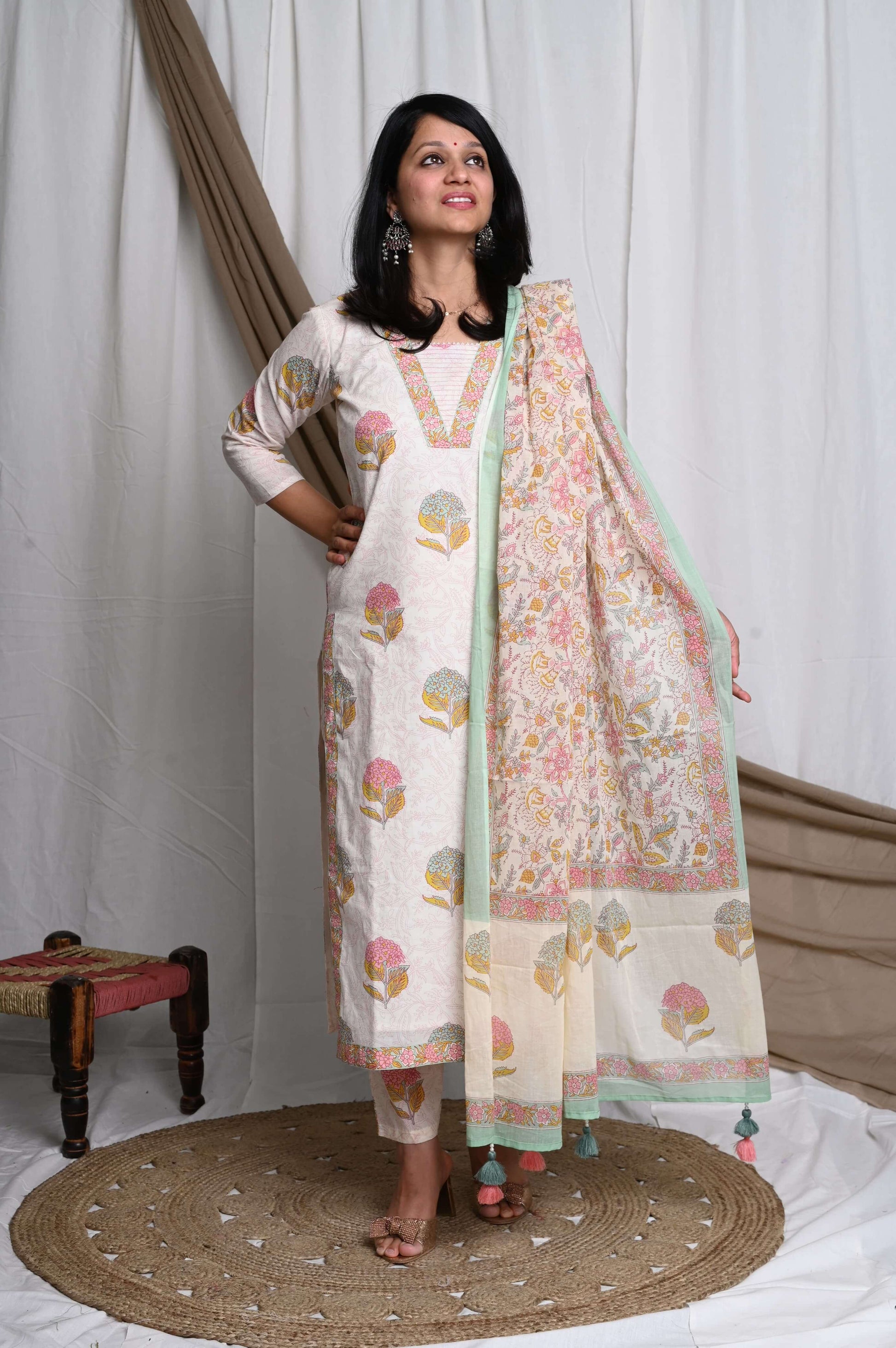This *Handblock* suit features a beautifully handcrafted yoke adorned with exquisite *pearl* *detailing* , accompanied by a soft mul cotton lining for maximum comfort. It also includes a meticulously hand-stitched dupatta, finished with delicate *hand-tied tassels* for a truly luxurious touch..