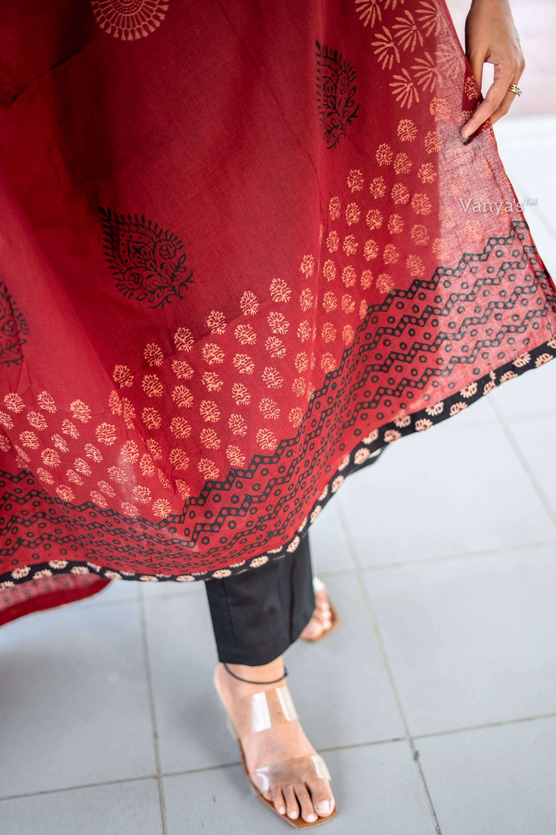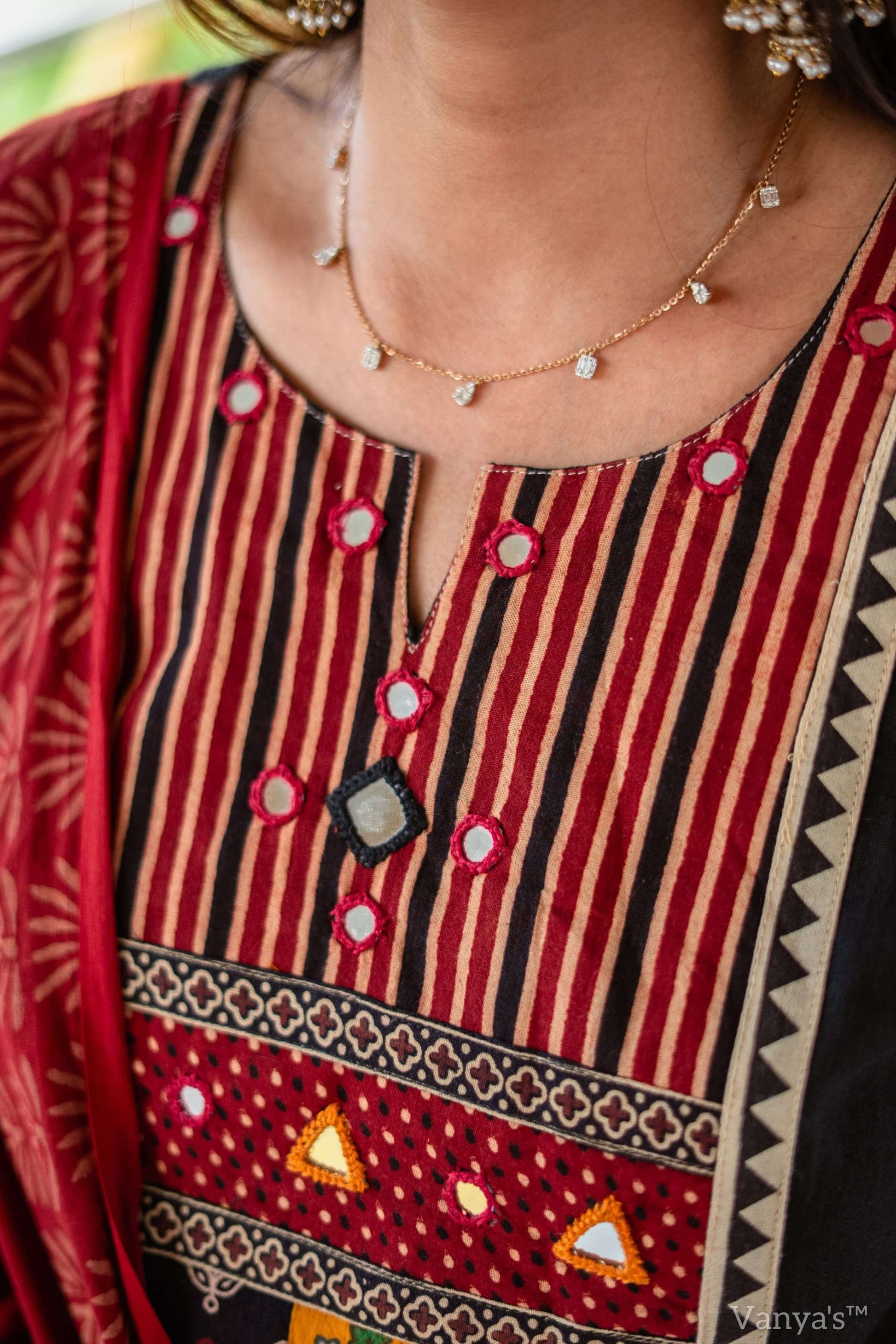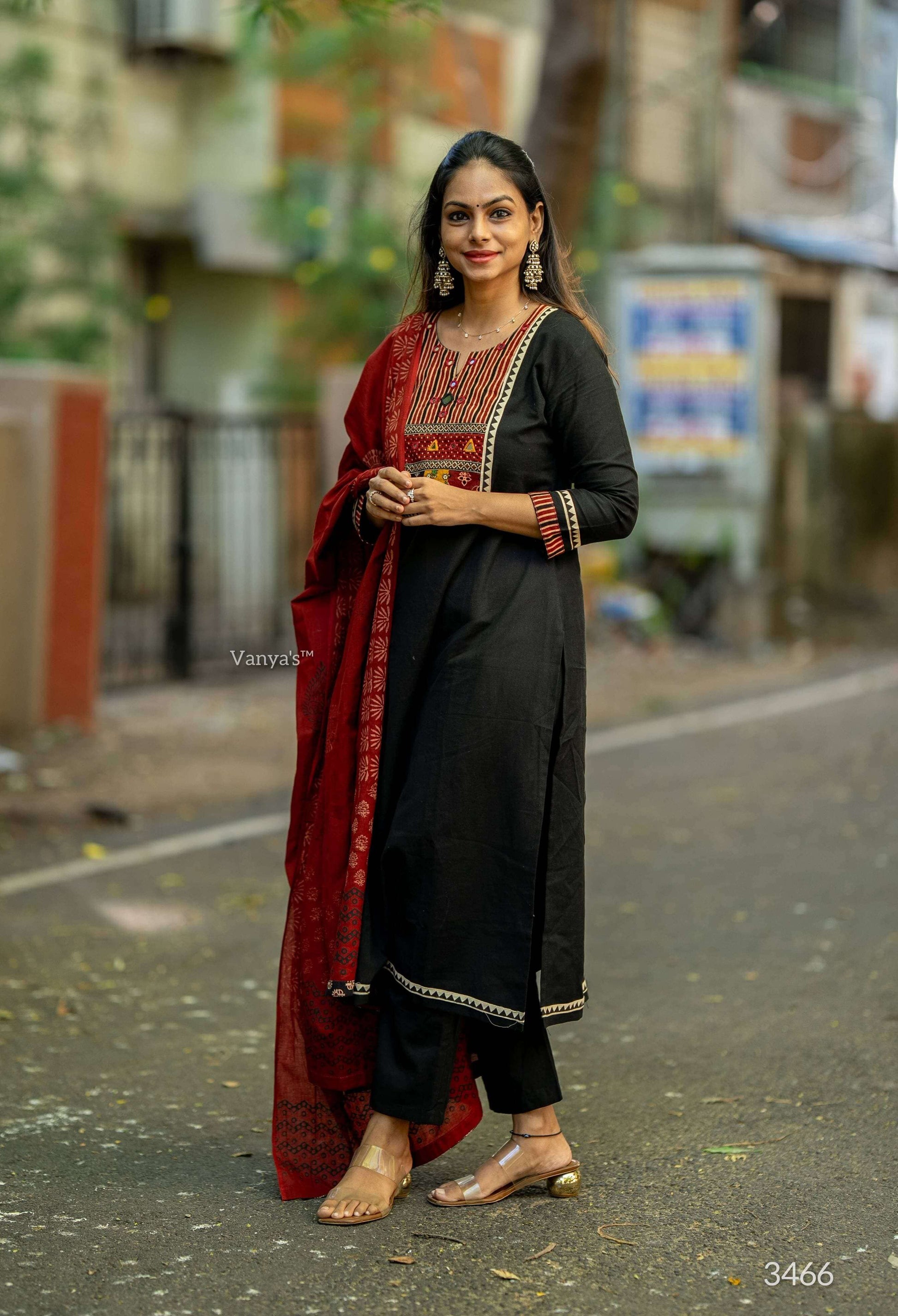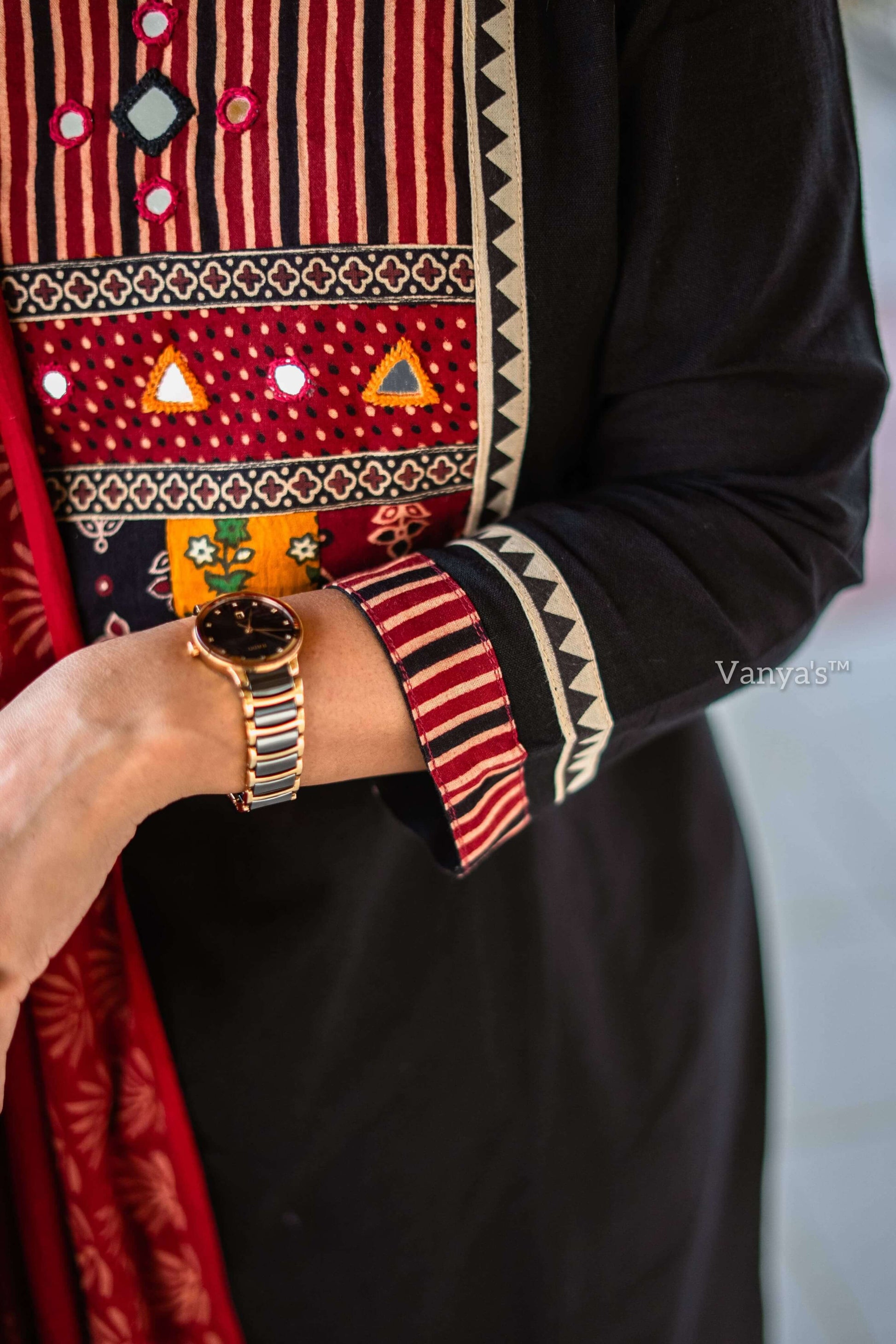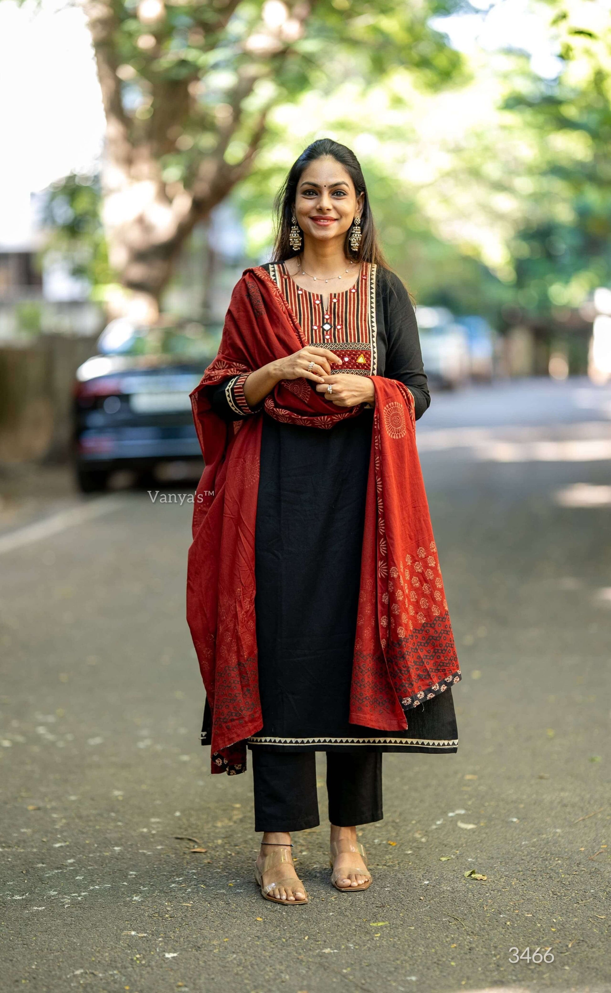 The Noor-e-Kaashi Suit Set solid black straight-cut *Handloom cotton* kurta is elevated by a stunning multicolor embroidered yoke, inspired by traditional Kaashi artistry, detailed with vertical stripe motifs. Paired with solid *Handloom cotton* black pants and a vibrant maroon printed cotton hand block dupatta.