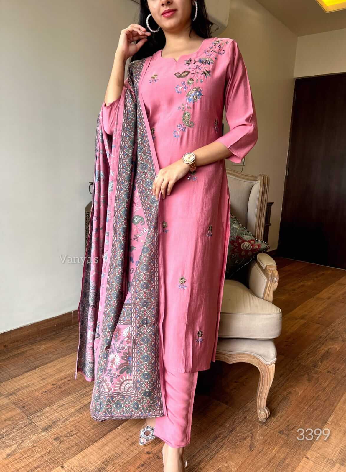 LOTUS dola silk elegant kurta is given an exquisite touch. Added Same printed very comfort dola silk fabric pant and paired with our MIL DYE Bombay printed chanderi silk duppata.